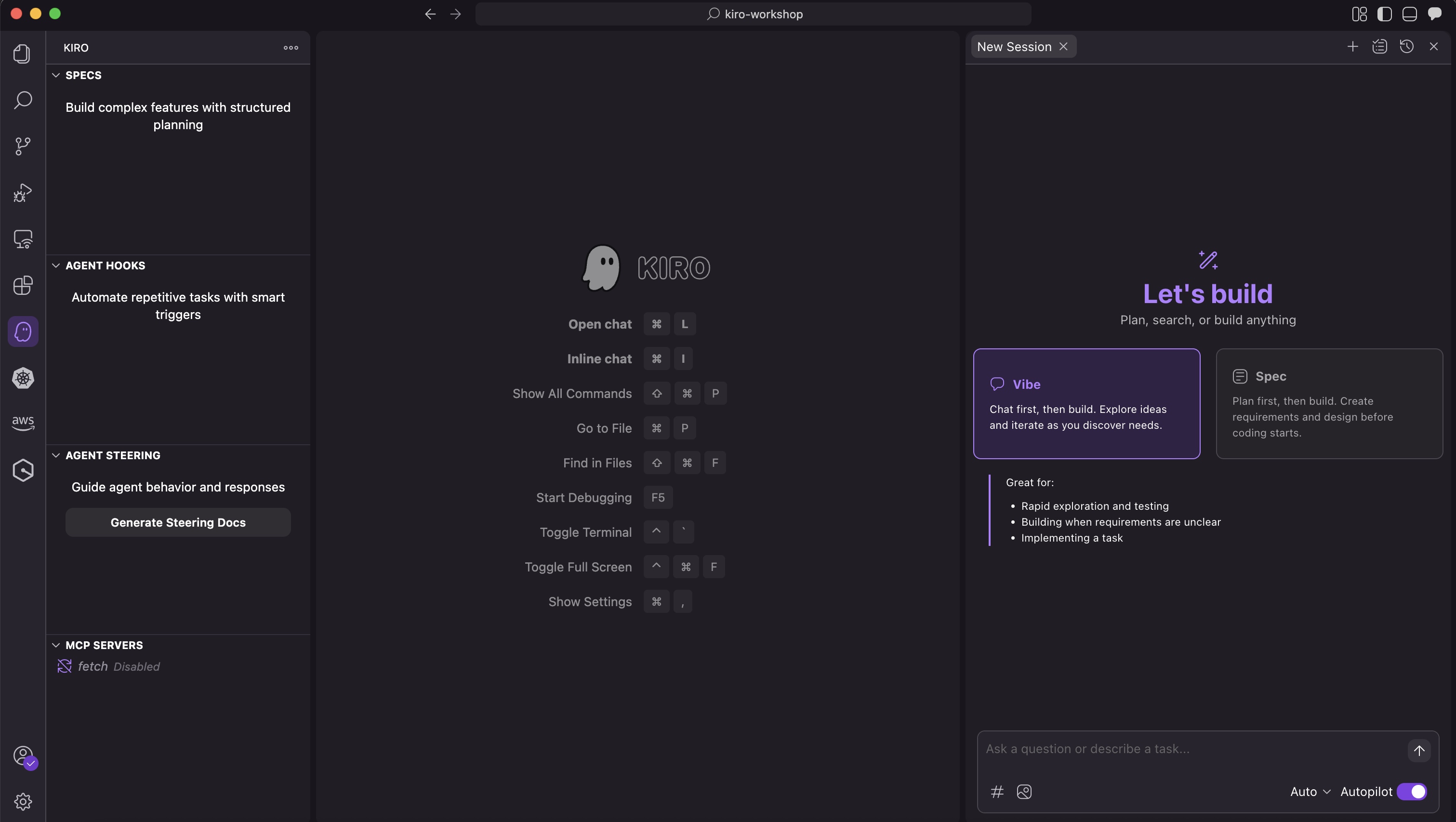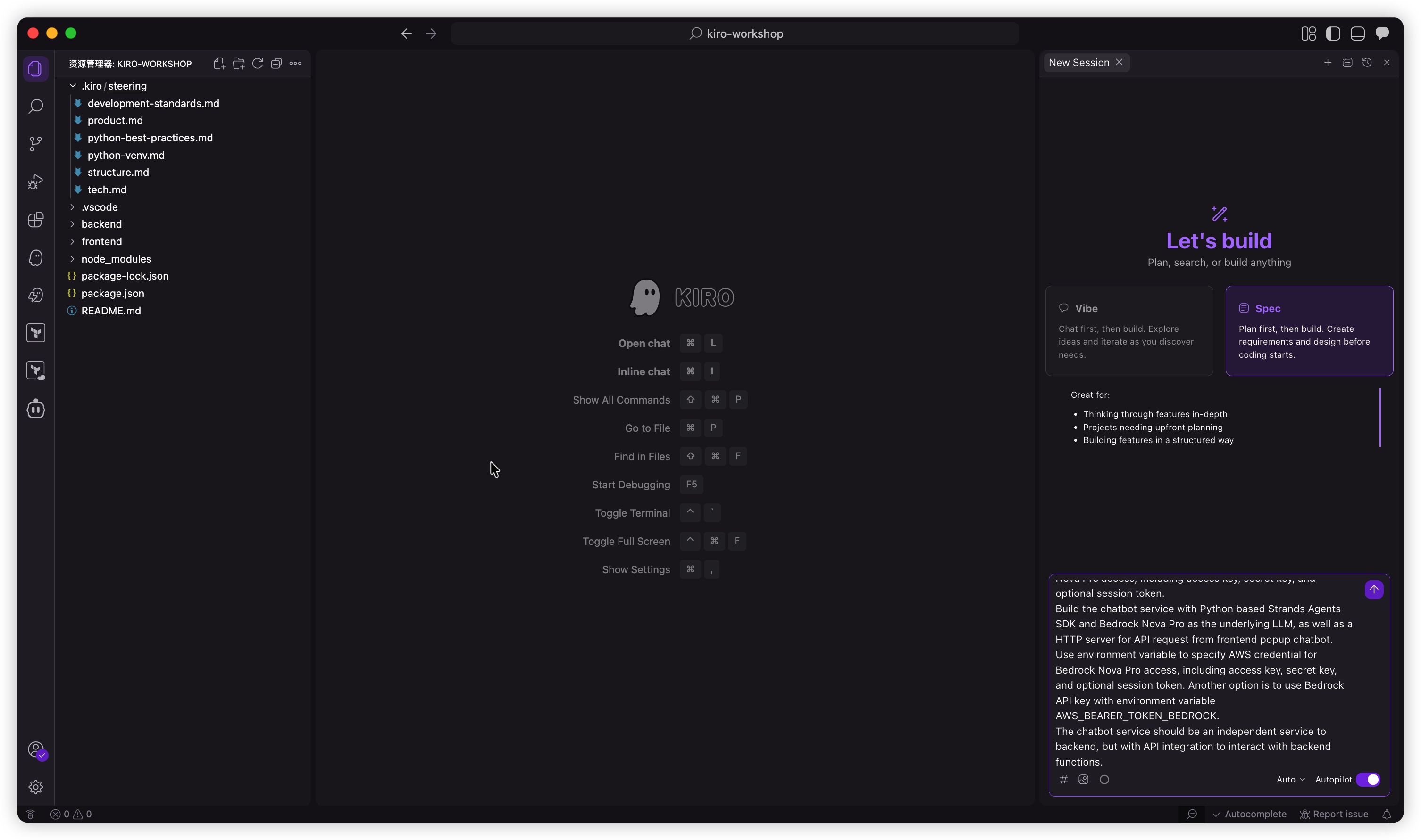 启动 Kiro 并打开您的项目(例如kiro-workshop):