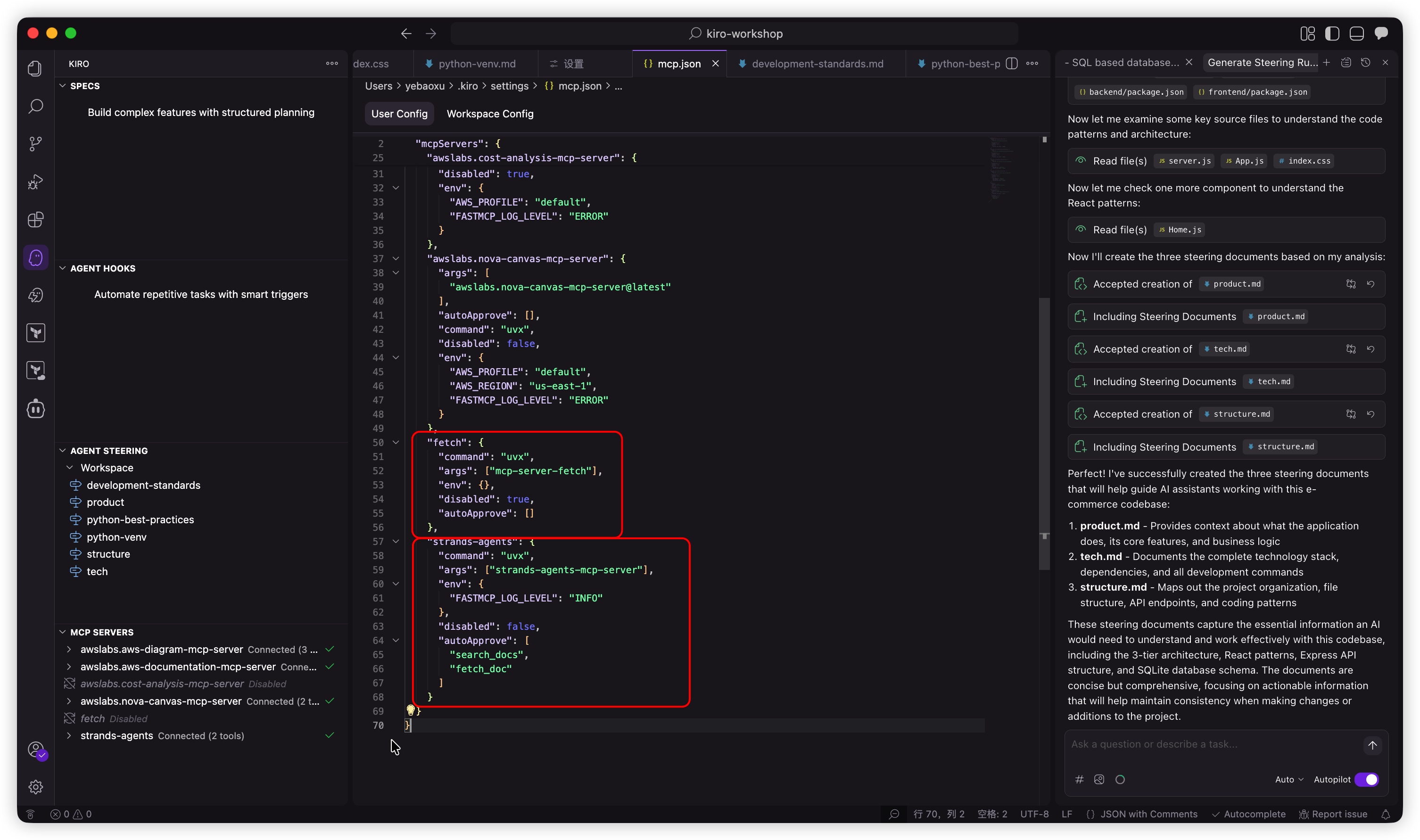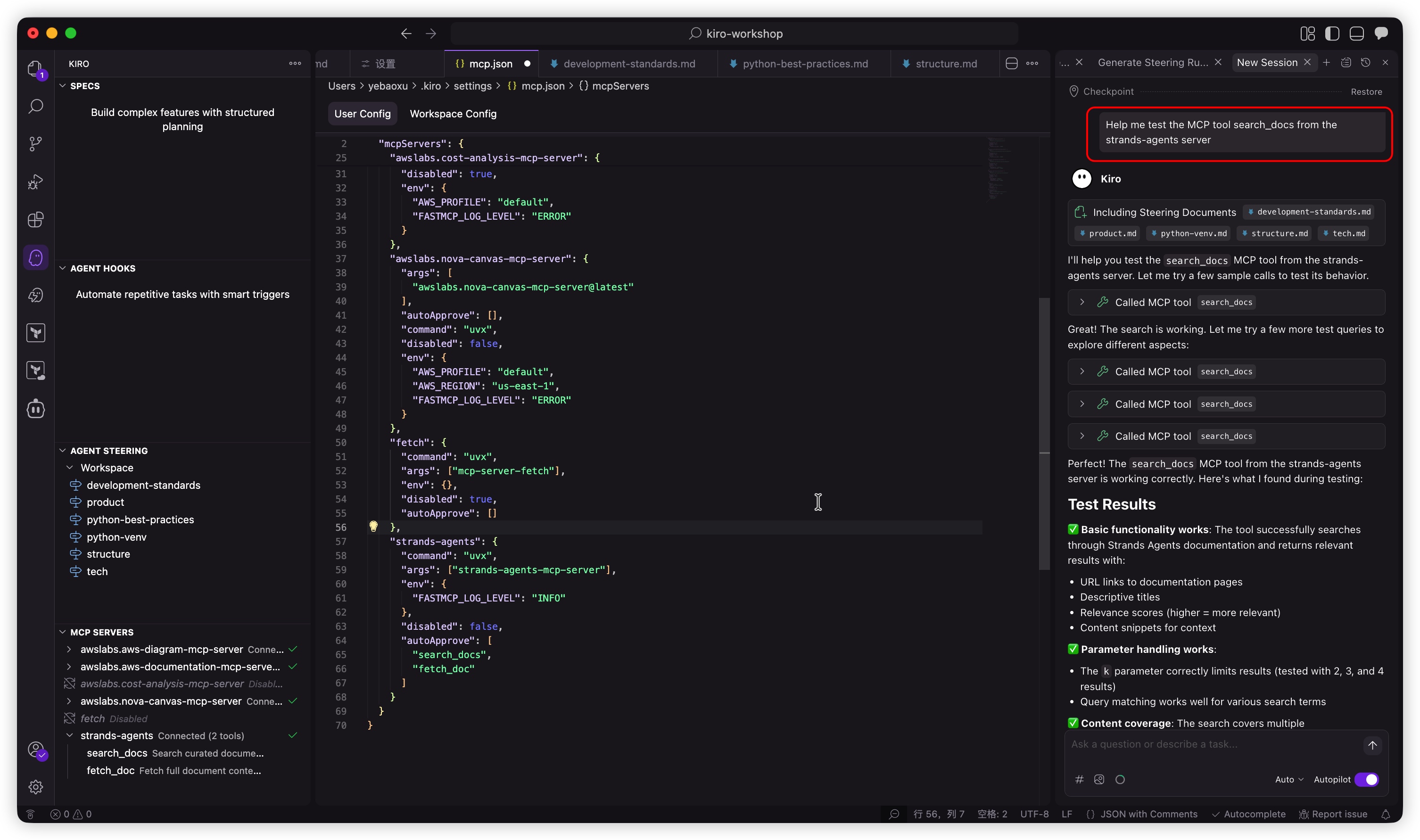 - 模型上下文协议 (MCP):通过直接服务器配置集成外部文档和专用工具,扩展了 Kiro 的功能。