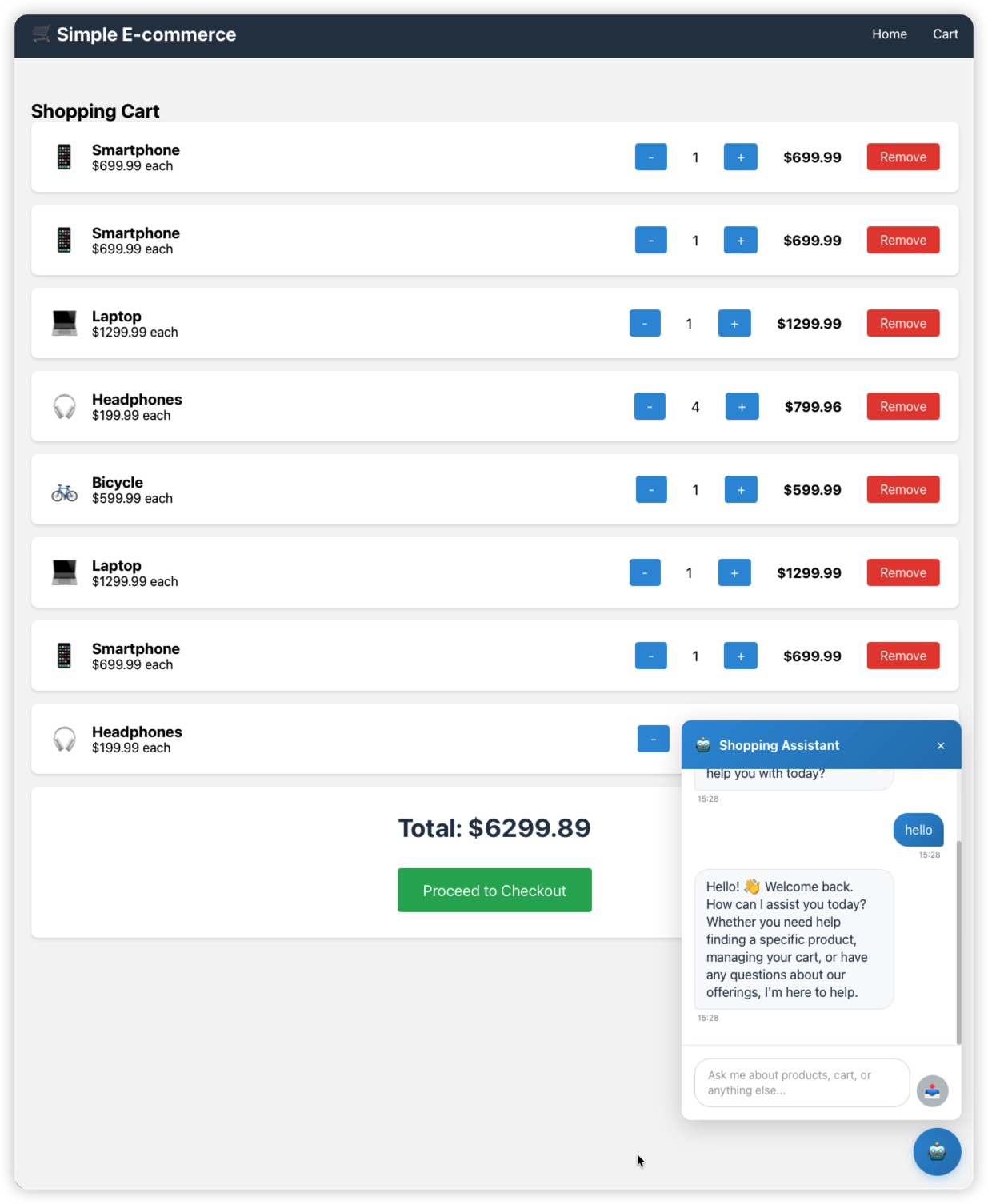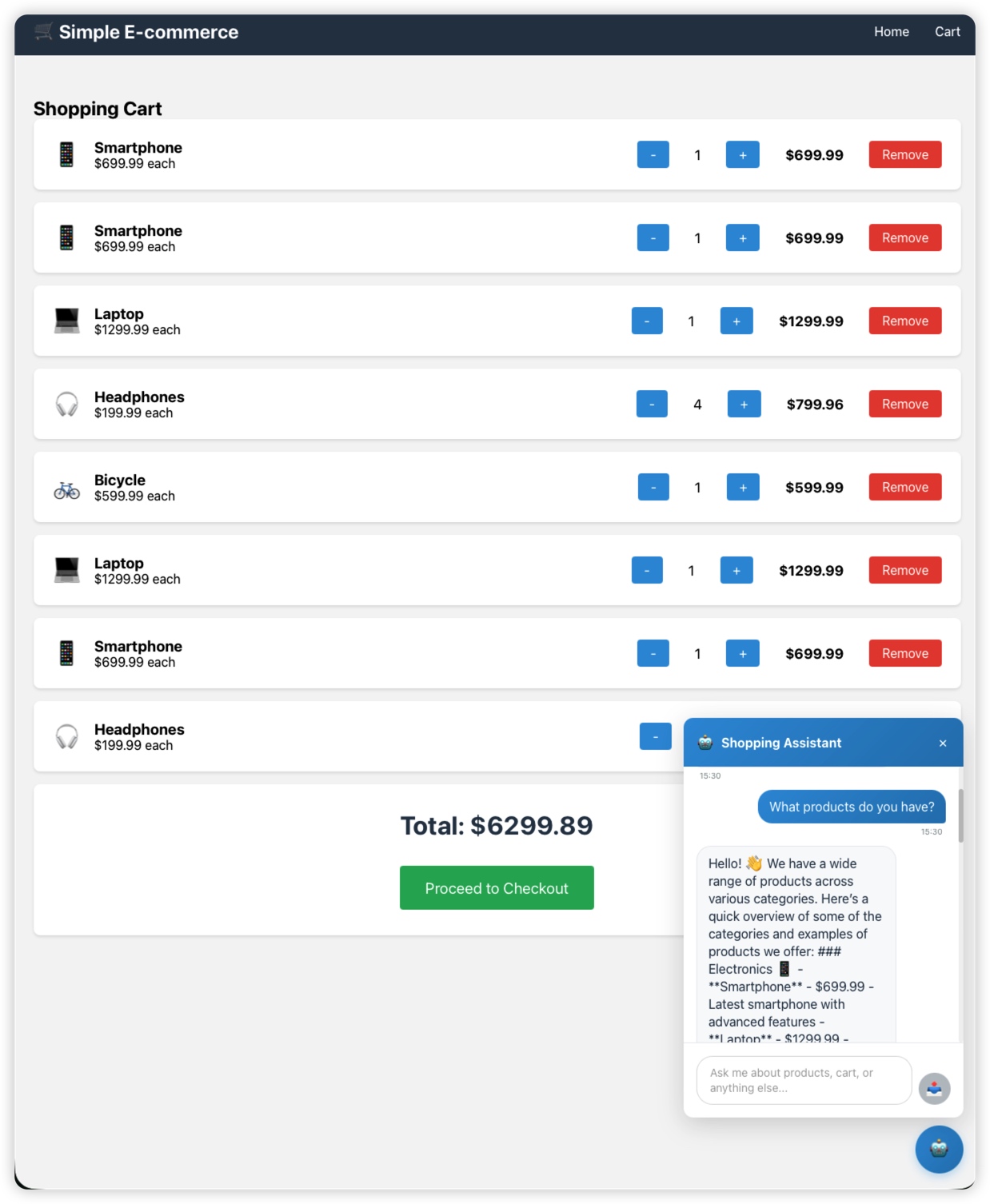 完整的用户工作流程,包括产品发现、购物车管理和智能助手