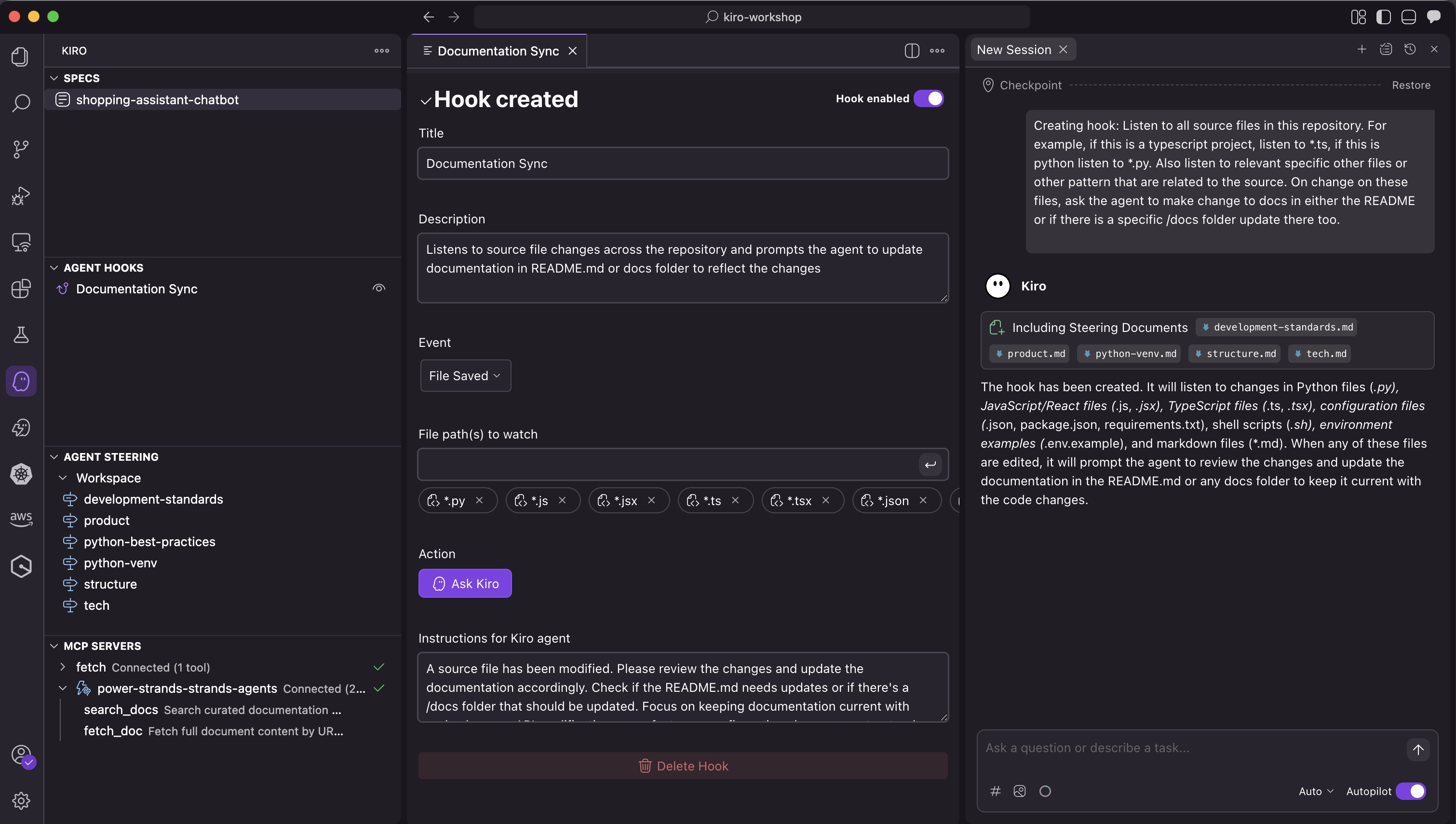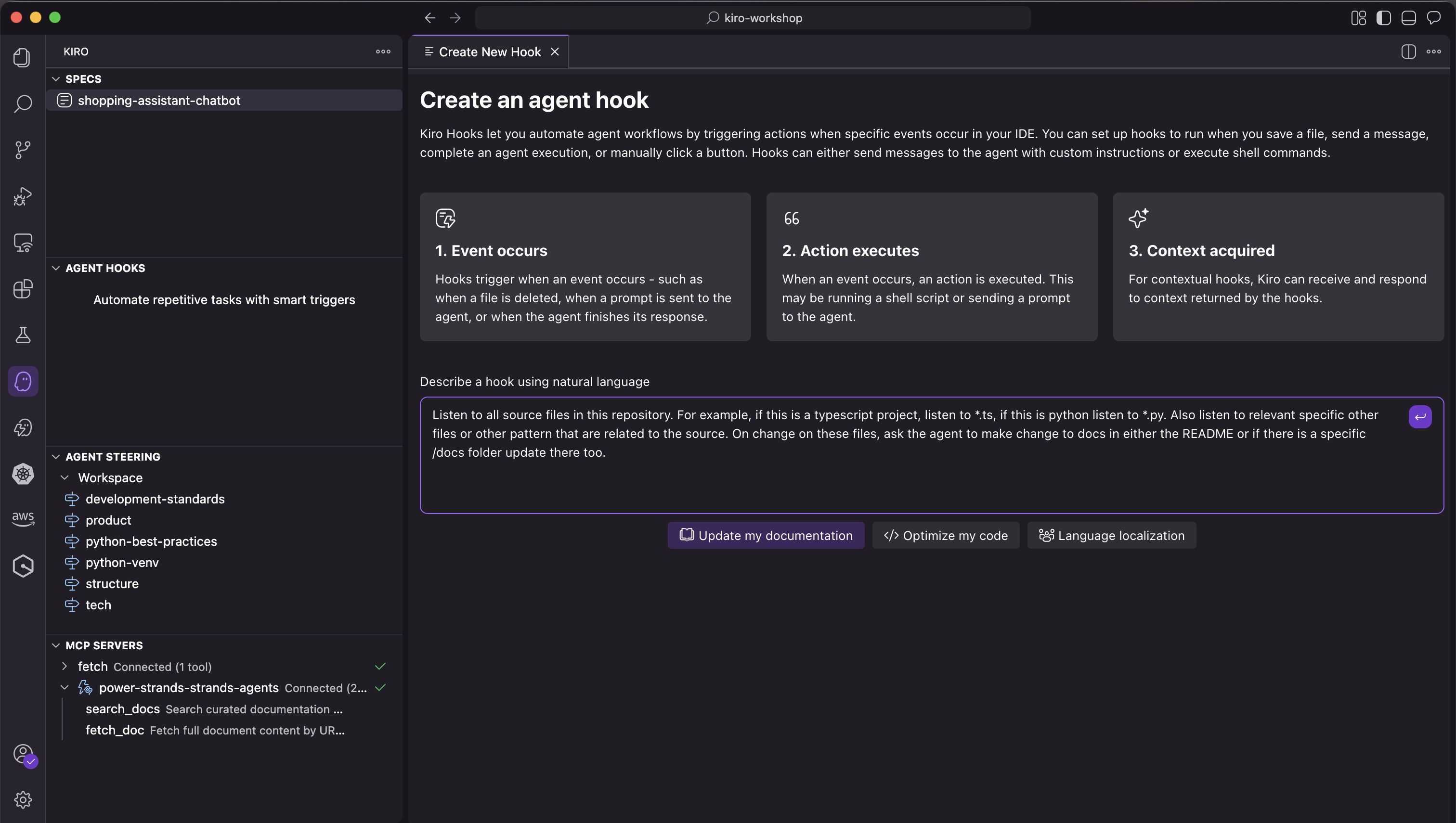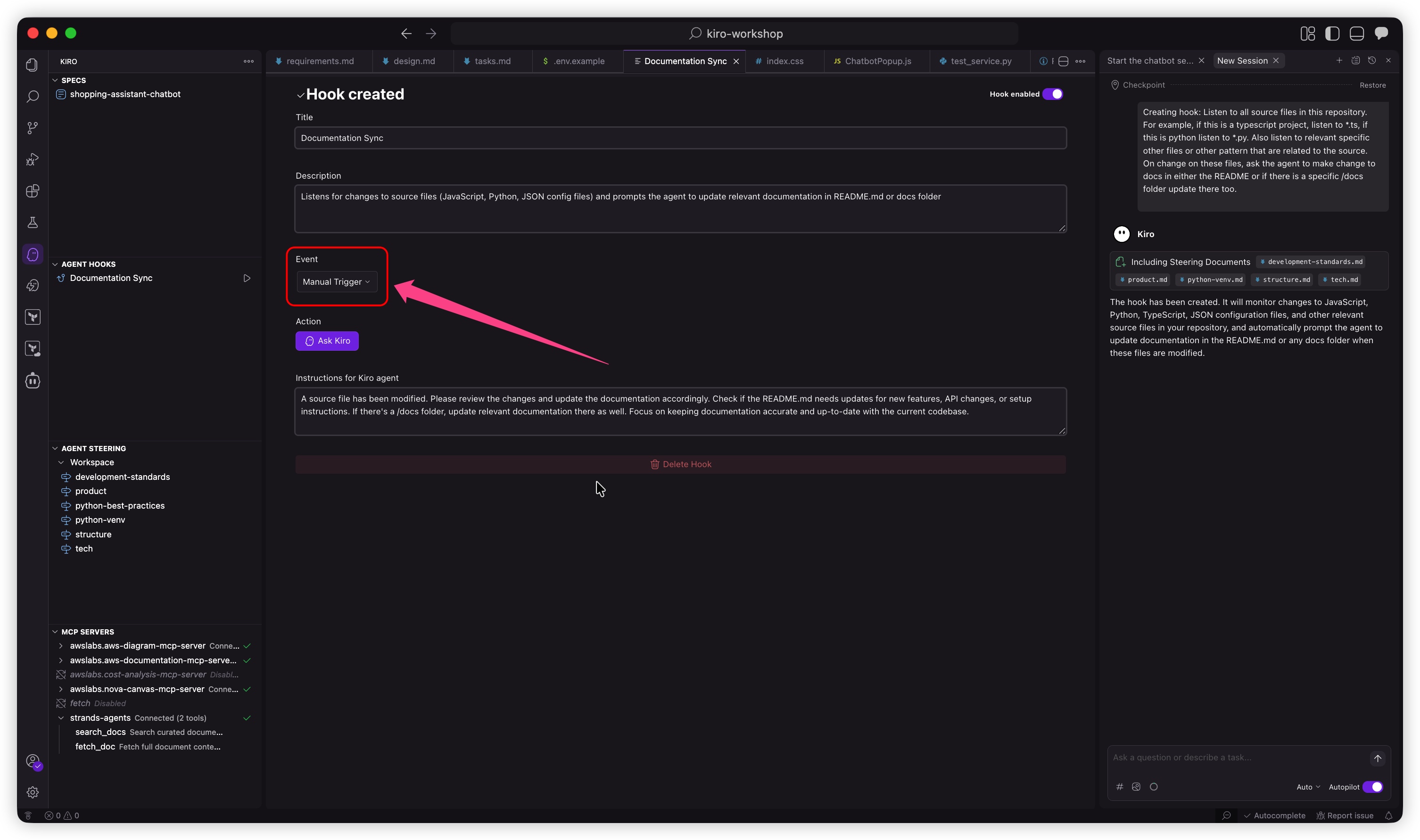 在本实验中,您将学习如何创建和使用 Kiro Agent Hooks,以根据 IDE 事件自动执行任务。您将创建一个文档同步钩子,以便在文件更改时自动更新项目文档,并探索自动和手动触发选项。
