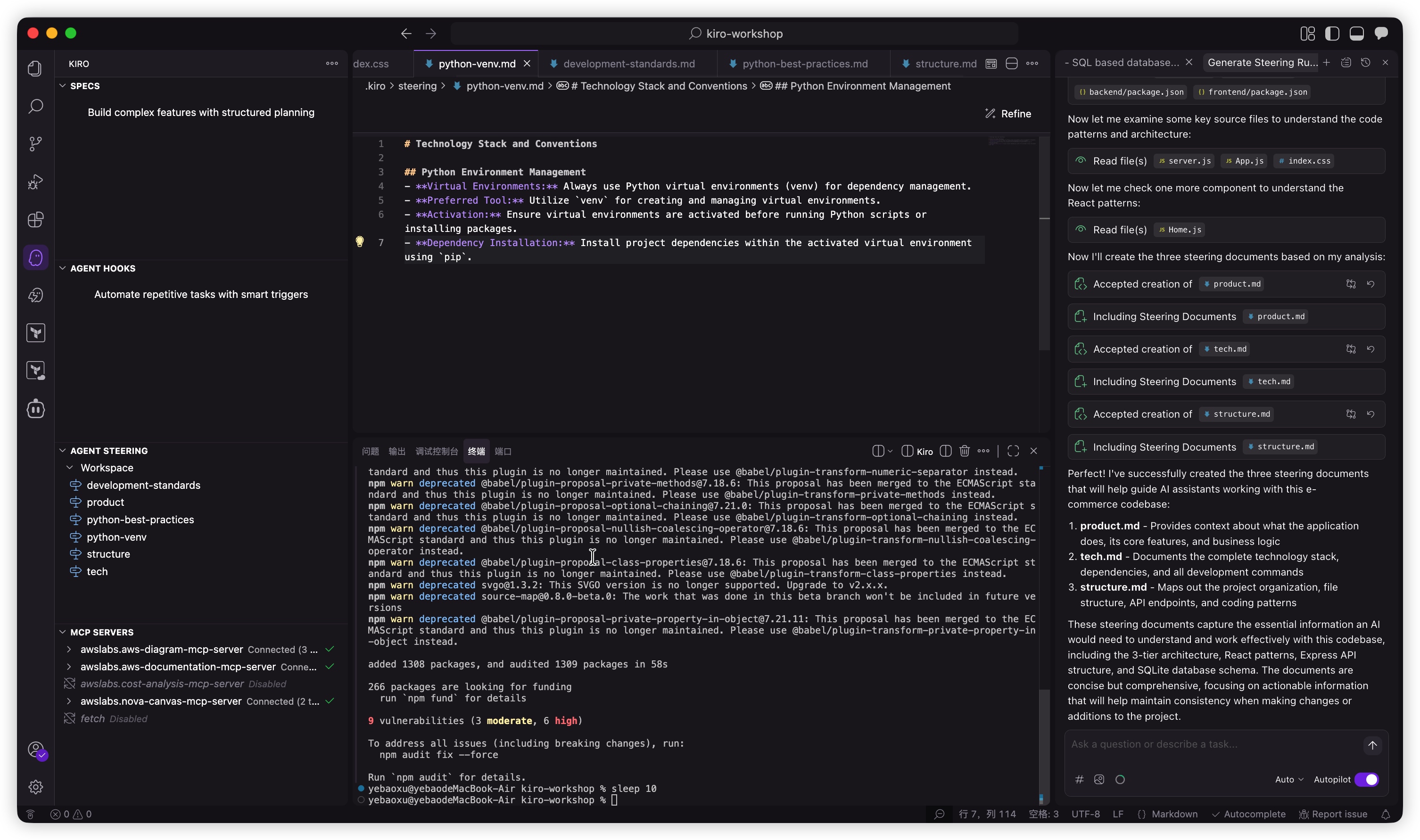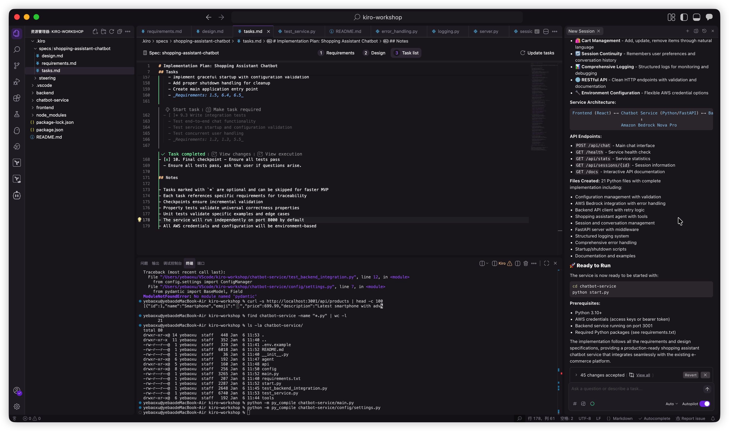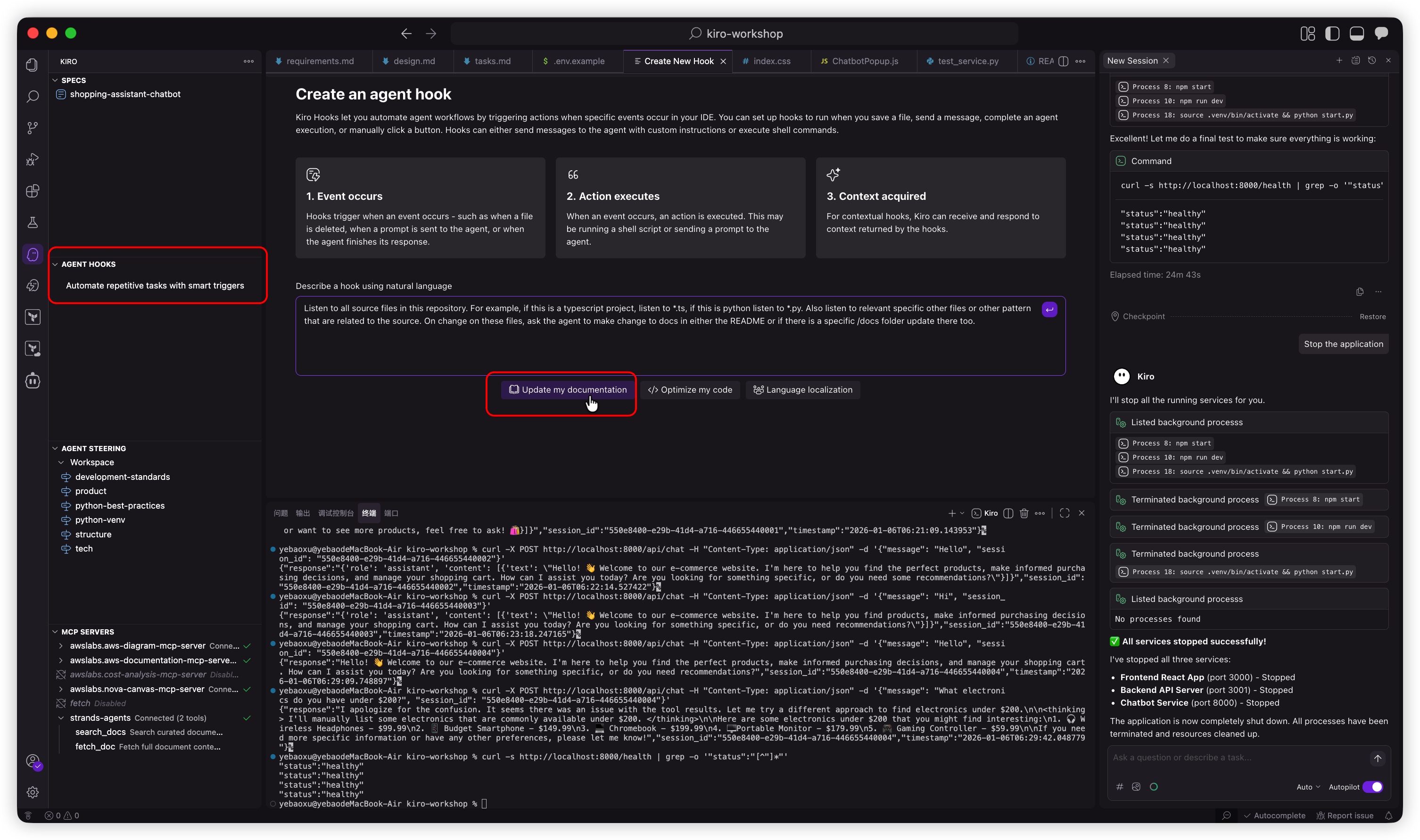 在 Kiro 聊天面板中,您将看到钩子过程和正在更新的文档,包括,以及在 Lab 2 中生成的README.md转向文件 - product.md。查看这些文件以了解文档中的更改。tech.mdstructure.md