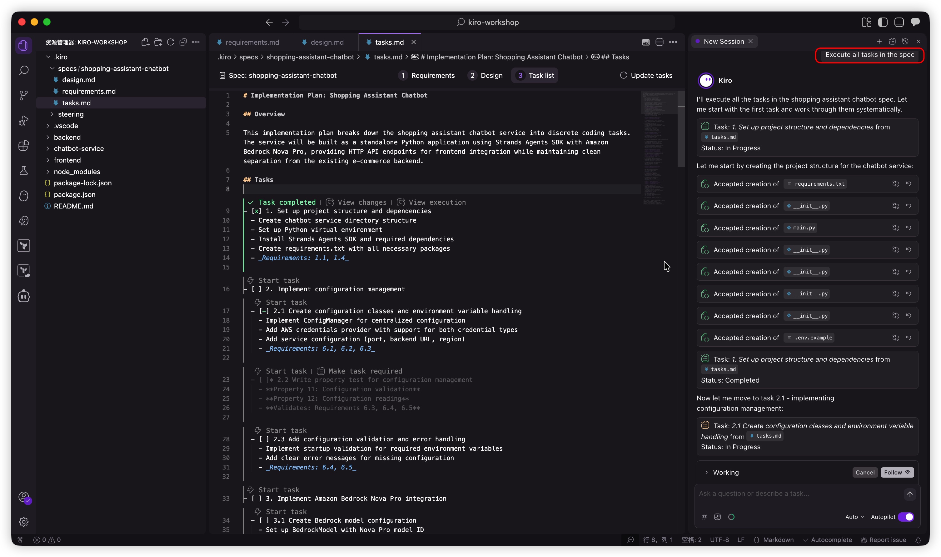 在任务管理器中task.md,点击每个任务上方的“⚡开始任务”按钮,逐个执行任务,进行必要的代码更改并运行命令。或者,您也可以一次性执行所有任务。 请在tasks.md文件中向 Kiro 发送以下提示: