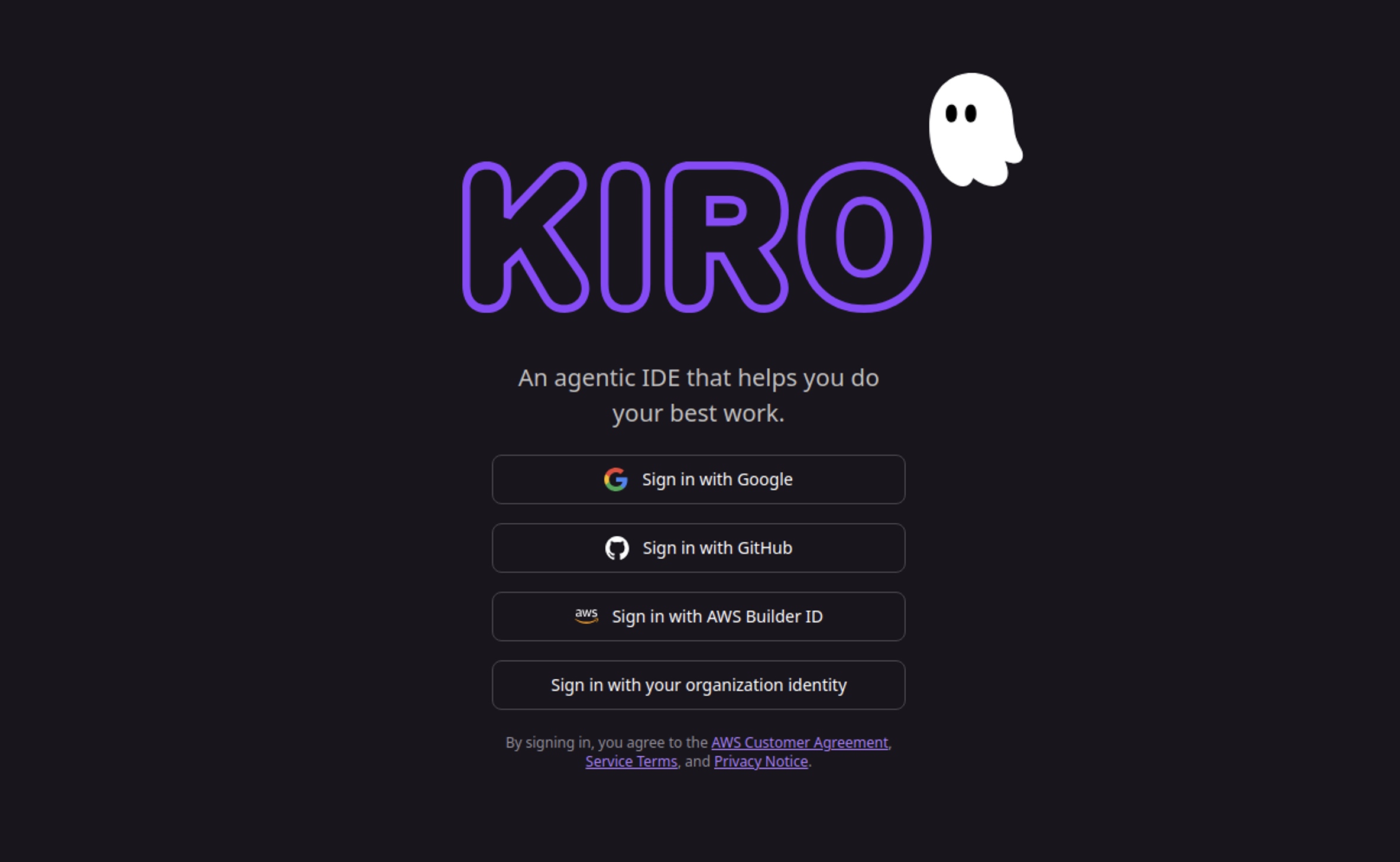 首次打开 Kiro 时,系统会提示您使用您选择的身份验证方式登录,包括社交账号和 AWS 登录选项。了解更多身份验证方法。