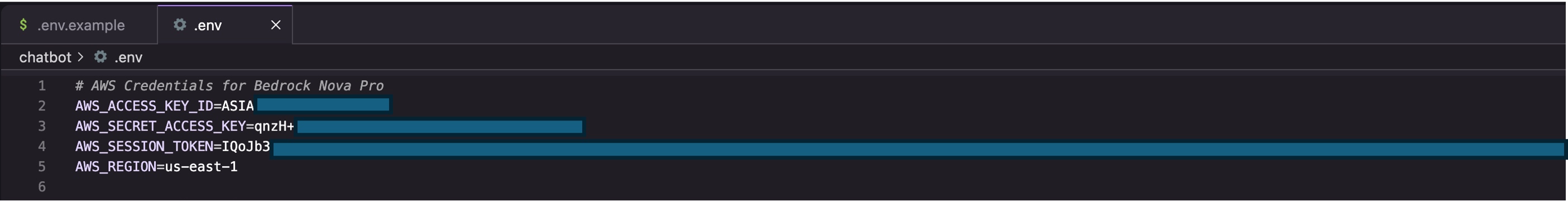 Use environment variable to specify AWS credential for Bedrock Nova Pro access, including access key, secret key, and optional session token. Another option is to use Bedrock API key with environment variable AWS_BEARER_TOKEN_BEDROCK.