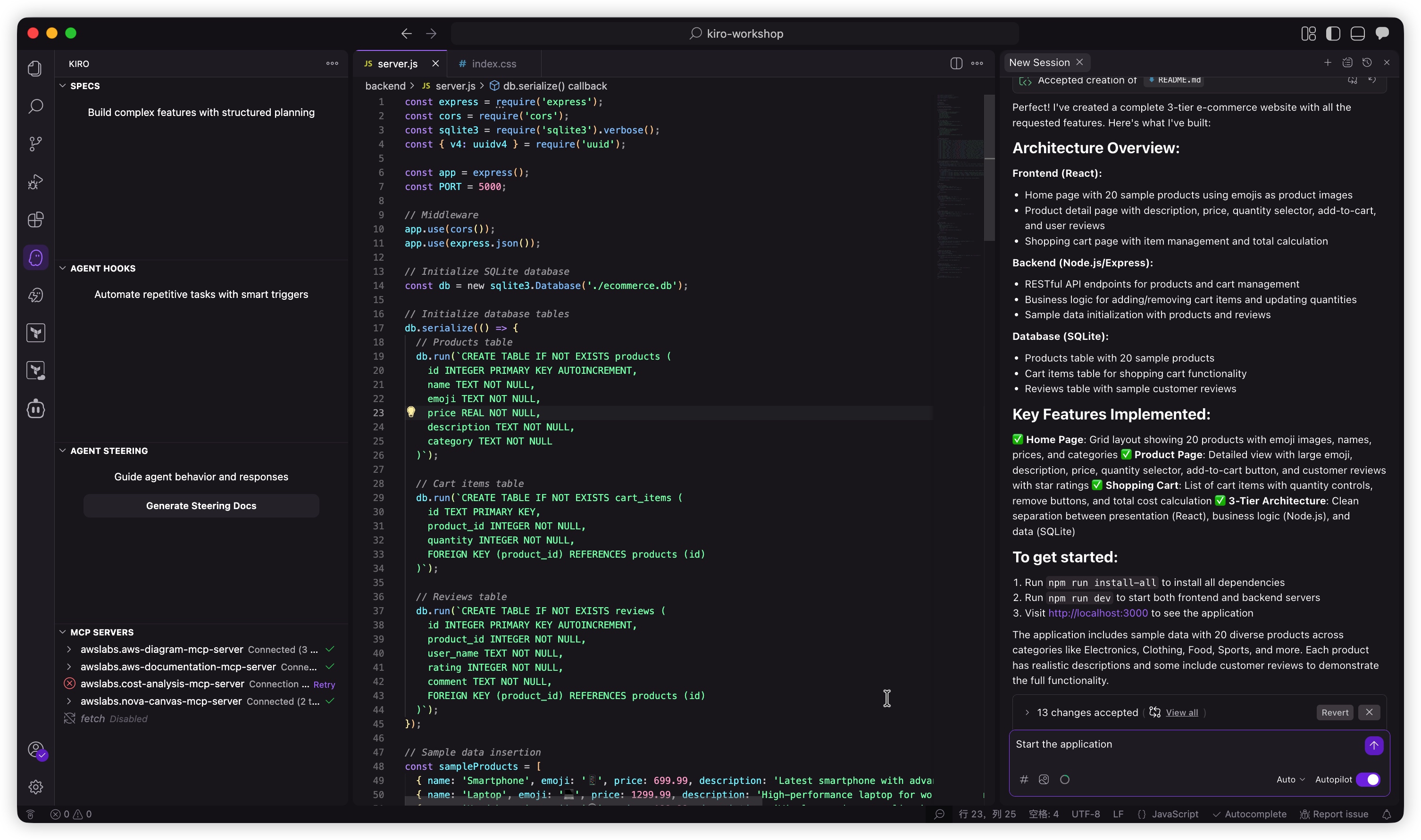 已成功完成使用 Kiro 构建带有 AI 代理聊天机器人的电子商务网站的综合研讨会。通过这次实践体验,探索了 AI 驱动的开发功能的全部范围,这些功能正在改变现代应用程序的构建方式。