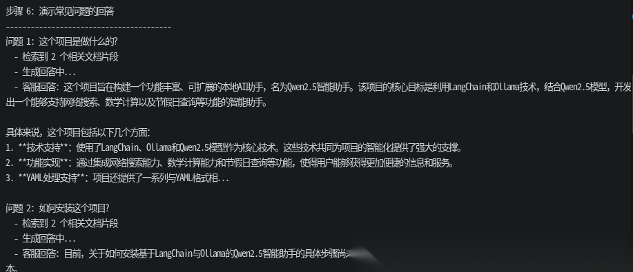 #!/usr/bin/env python3# -*- coding: utf-8 -*-"""RAG客服系统演示脚本展示基于检索增强生成的客服问答功能"""from langchain_core.prompts import ChatPromptTemplatefrom langchain_ollama import ChatOllamafrom langchain_text_splitters import RecursiveCharacterTextSplitterfrom langchain_community.vectorstores import FAISSfrom langchain_ollama import OllamaEmbeddingsfrom langchain_core.documents import Documentfrom langchain_core.output_parsers import StrOutputParserfrom langchain_core.runnables import RunnablePassthroughimport timedef format_docs(docs): """格式化文档""" return "\n\n".join([doc.page_content for doc in docs])def demo_rag_customer_service(): """演示RAG客服系统""" print("演示: 基于RAG的客服问答系统") print("=" * 60) # 项目相关的知识库文档 knowledge_base = [ Document( page_content=""" 项目名称: 基于LangChain与Ollama的Qwen2.5智能助手 项目功能: 构建一个支持网络搜索、数学计算、节假日查询的本地AI Agent 核心技术: LangChain, Ollama, Qwen2.5模型 项目目标: 提供一个功能丰富、可扩展的本地AI助手解决方案 """, metadata={"source": "project_overview"} ), Document( page_content=""" agent.py - Agent核心创建模块 功能: 创建工具调用Agent,包含Qwen2.5模型初始化、提示模板定义、Agent执行器创建 主要函数: create_qwen_agent() 使用的模型: qwen2.5:7b API端点: http://localhost:11434 作用: 定义AI Agent的核心逻辑和行为 """, metadata={"source": "agent_module"} ), Document( page_content=""" tools.py - 工具函数模块 功能: 定义AI Agent可使用的各种工具 包含工具: - 网络搜索工具 (DuckDuckGoSearchRun) - 数学计算器 (calculator) - 节假日查询工具 (get_today_holiday, get_date_holiday, get_month_holidays, get_year_holidays) - Python代码解释器 (python_code_interpreter) - 天气查询工具 (get_weather) - 货币兑换工具 (currency_converter) - 股票价格查询工具 (get_stock_price) - YAML处理工具 (yaml_parser, yaml_generator, read_yaml_file, write_yaml_file) """, metadata={"source": "tools_module"} ), Document( page_content=""" run.py - 主运行模块 功能: 提供用户交互界面,启动Agent并处理用户输入 交互方式: 命令行输入输出 退出命令: exit, quit, bye 作用: 项目的入口点,负责用户交互循环 """, metadata={"source": "run_module"} ), Document( page_content=""" LangChain框架介绍: LangChain是一个强大的框架,用于构建语言模型驱动的应用程序。 核心组件: - Prompts: 定义如何向语言模型提出问题 - LLMs: 语言模型接口 - Chains: 将多个组件链接在一起 - Agents: 使用工具的语言模型 - Memory: 在请求之间保持状态 - Tools: 允许Agent访问外部系统的功能 """, metadata={"source": "langchain_intro"} ), Document( page_content=""" RAG系统 (Retrieval-Augmented Generation): RAG代表检索增强生成,是一种结合检索和生成的技术。 工作原理: 1. 将文档转换为向量并存储在向量数据库中 2. 将用户问题转换为向量 3. 在向量数据库中搜索最相似的文档 4. 将检索到的文档与问题一起发送给语言模型 5. 语言模型基于上下文生成答案 优势: 提高回答的准确性和相关性 """, metadata={"source": "rag_system"} ), Document( page_content=""" 安装和部署: 1. 安装依赖: pip install -r requirements.txt 2. 启动Ollama服务: ollama serve 3. 下载模型: ollama pull qwen2.5:7b 4. 运行程序: python run.py 确保Ollama服务在 http://localhost:11434 运行 """, metadata={"source": "installation"} ), Document( page_content=""" 常见问题解答: Q: 如何启动项目? A: 首先运行 'ollama serve',然后下载模型 'ollama pull qwen2.5:7b',最后运行 'python run.py' Q: 如何使用工具? A: Agent会自动根据问题内容选择合适的工具,用户无需手动调用 Q: 支持哪些功能? A: 支持网络搜索、数学计算、节假日查询、天气查询、货币兑换、股票价格查询、YAML处理等 Q: 如何扩展功能? A: 可以通过在tools.py中添加新的工具函数来扩展功能 """, metadata={"source": "faq"} ), Document( page_content=""" YAML处理功能: 项目支持YAML格式处理,包括: - yaml_parser: 解析YAML内容 - yaml_generator: 将字典转换为YAML格式 - read_yaml_file: 读取YAML文件 - write_yaml_file: 写入YAML文件 依赖: PyYAML库 """, metadata={"source": "yaml_features"} ) ] print("步骤 1: 创建知识库...") print(f" - 知识库包含 {len(knowledge_base)} 个文档片段") # 分割文档 print("步骤 2: 分割文档...") text_splitter = RecursiveCharacterTextSplitter(chunk_size=300, chunk_overlap=50) split_docs = text_splitter.split_documents(knowledge_base) print(f" - 分割后得到 {len(split_docs)} 个文档块") # 创建嵌入和向量存储 print("步骤 3: 创建向量数据库...") try: embeddings = OllamaEmbeddings(model="nomic-embed-text", base_url="http://localhost:11434") vectorstore = FAISS.from_documents(split_docs, embeddings) retriever = vectorstore.as_retriever(search_kwargs={"k": 2}) print(" - 向量数据库创建成功") except Exception as e: print(f" - 创建向量数据库时出错: {e}") return # 初始化语言模型 print("步骤 4: 初始化语言模型...") try: llm = ChatOllama(model="qwen2.5:7b", base_url="http://localhost:11434", temperature=0.2) print(" - 语言模型初始化成功") except Exception as e: print(f" - 初始化语言模型时出错: {e}") return # 客服问答提示模板 customer_service_prompt = ChatPromptTemplate.from_messages([ ("system", """你是一个 helpful 的客服助手,专门回答关于LangChain与Ollama Qwen2.5智能助手项目的问题。 使用以下上下文信息来回答用户的问题。如果上下文信息不足以回答问题,请说明你无法根据现有信息回答。 保持回答专业、准确且有帮助。 上下文信息: {context}"""), ("human", "问题: {question}\n\n请提供详