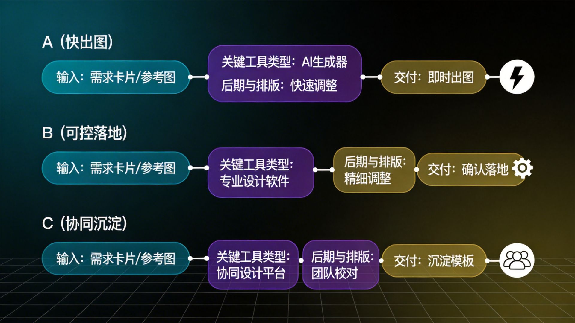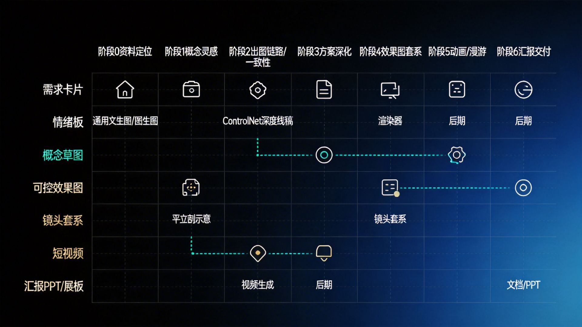 很多团队在选“AI 出图工具”时会卡在两件事:一是工具太多(文生图、图生图、渲染器、插件、后期、视频……),二是交付物太多(概念、方案、效果图、动画、汇报板、图纸……)。与其按“某个软件很火”去选,不如按你真实的工作流去选:把项目拆成“阶段×交付物”,每个格子只挑能稳定产出该交付物的一到两类工具。