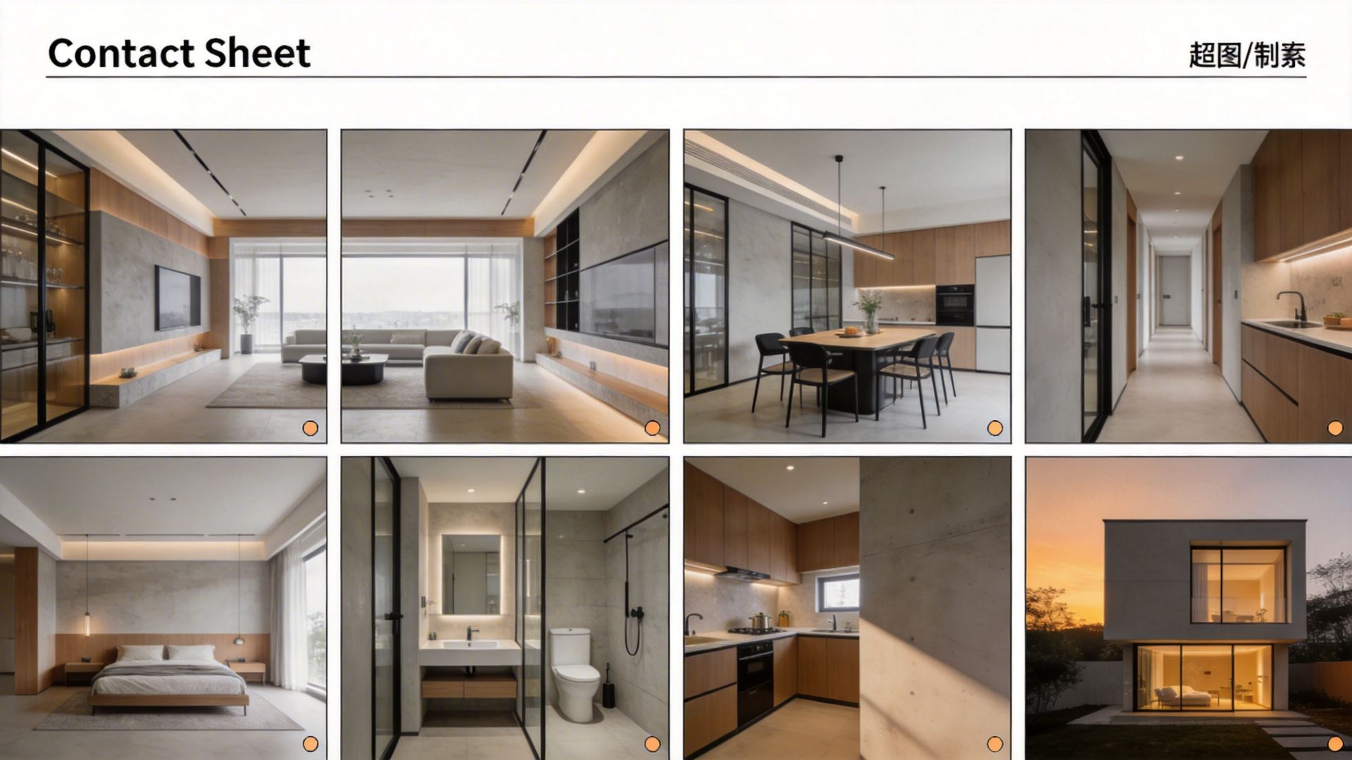 常见交付物 - 室内效果图(客餐厅、卧室、公共区、商业空间等) - 建筑外观(白天/黄昏/夜景、近人/远景) - 景观节点(入口、轴线、活动场地、水景、夜景灯光) - “同一方案”多角度、多房间、多人协作的效果图套系