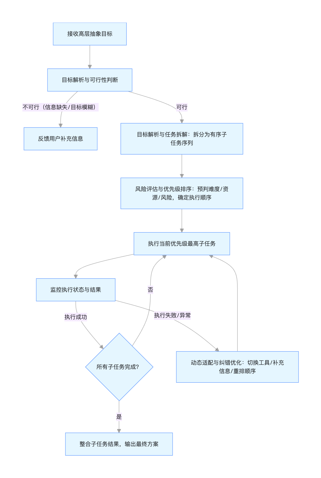 - 目标解析与任务拆解:核心是将模糊、抽象的高层目标转化为清晰、可执行的子任务序列。该能力需具备场景化的语义理解与逻辑拆分能力,例如面对“组织跨部门季度总结会议”这一模糊需求,Agent可拆解为“确定会议时间(协调多部门日程)→ 筛选会议场地(匹配人数与设备需求)→ 准备会议材料(收集各部门总结)→ 发送会议通知(同步议程与参会要求)→ 安排会议记录(确定记录人或启用录音转录)”等有序子任务,并为每个子任务明确输入输出标准。
