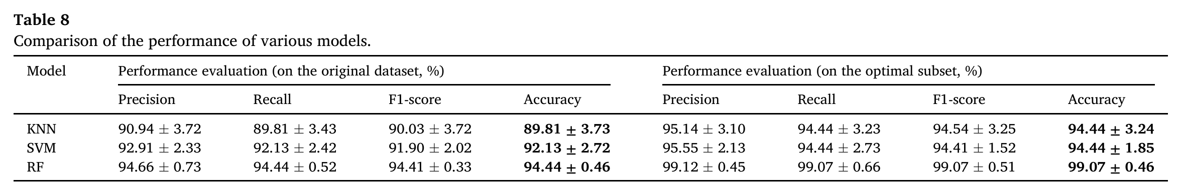 对比三种模型在原始参数集和SHAP 筛选后的最优参数集上的诊断性能,评价指标包括精确率、召回率、F1 分数、准确率(论文 Table8)。核心结论: