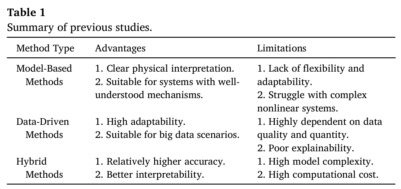 - 混合方法:精度和可解释性相对提升,但模型复杂度高、计算成本大,且未对物理模型与数据模型融合后的决策过程做详细分析。