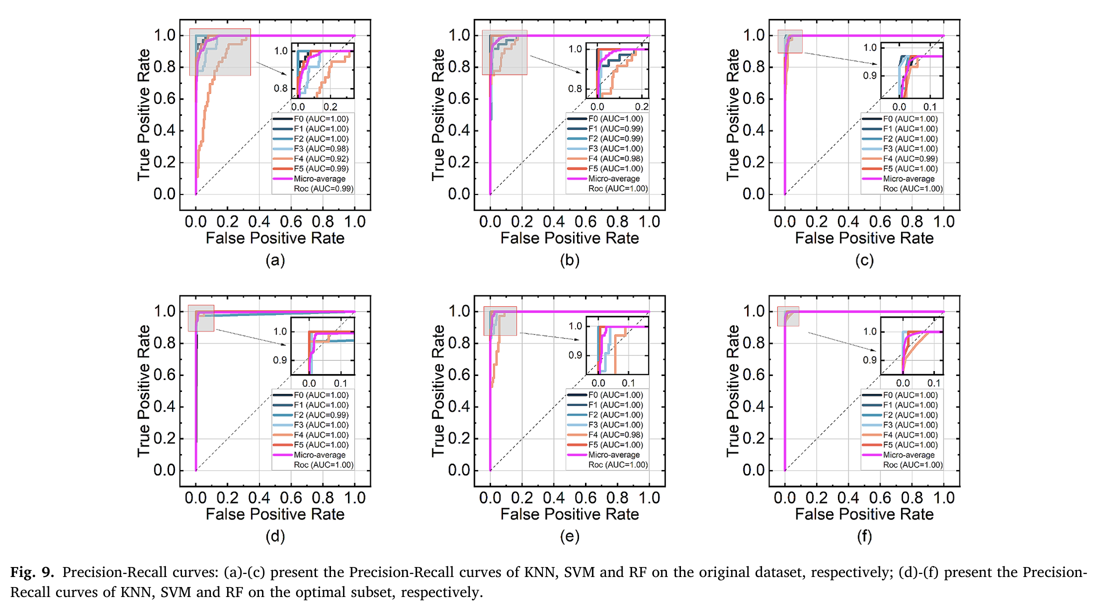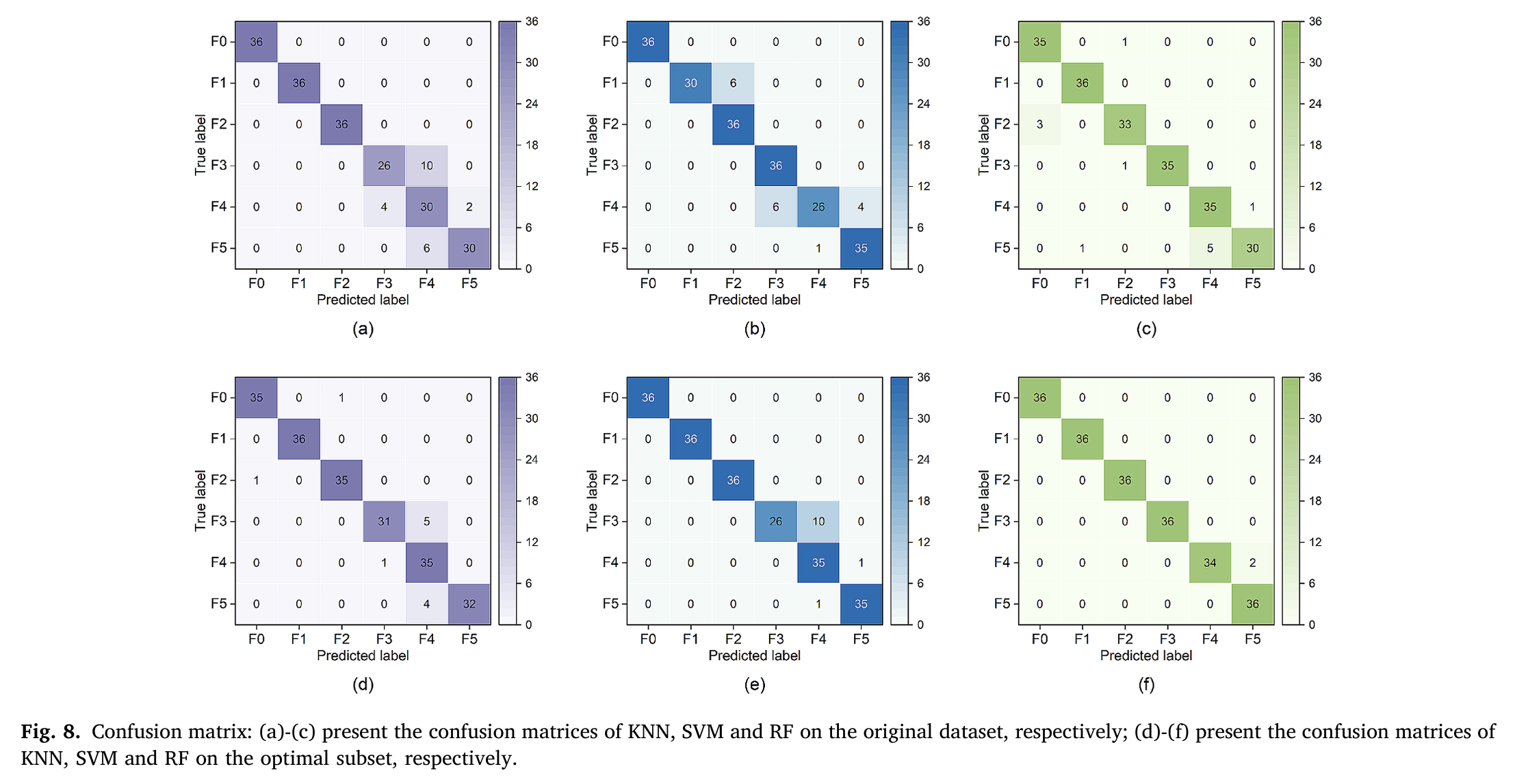 论文 Fig.8 和 Fig.9 分别展示了三种模型在原始参数集和最优参数集上的混淆矩阵、Precision-Recall 曲线。结果显示,TSRF 对各类故障的识别能力均表现优异,仅对活塞环磨损(F4)和粘滞(F5)的区分略有下降(两类故障均为活塞环相关,系统影响模式相似)。