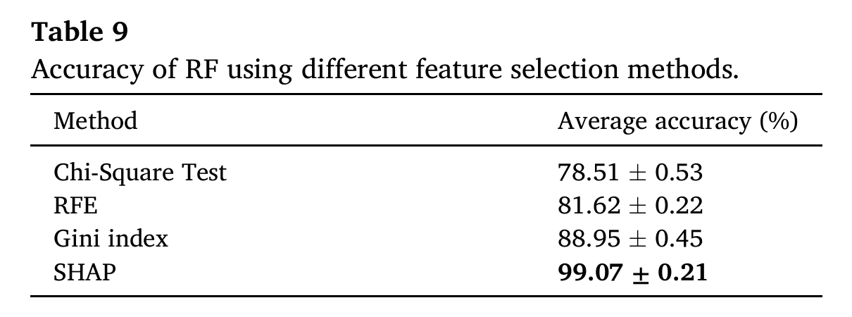 以 RF 为分类模型,对比卡方检验、RFE、基尼指数、SHAP 四种特征选择方法的诊断准确率(论文 Table9)。SHAP 方法的准确率(99.07%)高于其他方法,再次验证了其在特征选择上的优越性。