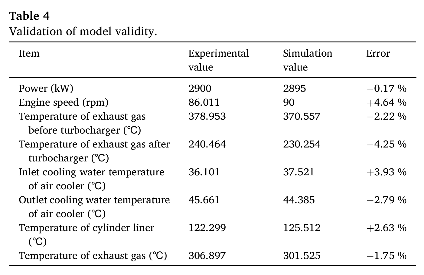 论文构建了包含进排气歧管、涡轮增压器、中冷器、6 个气缸的一维热力学模型(论文 Fig.2),清晰展示模型的系统边界、监测点、管路布局等核心结构。该模型的发动机核心参数如表 2 所示(缸径 620mm、行程 2658mm、6 缸直列、二冲程、额定功率 2900kW 等),为后续故障仿真奠定了基础。