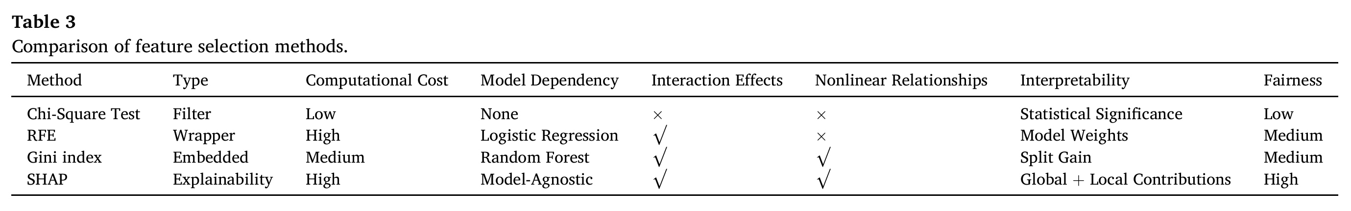 论文对比了卡方检验、递归特征消除(RFE)、基尼指数和 SHAP 四种方法,核心差异见论文 Table3。SHAP 作为模型无关的可解释性方法,不仅能量化参数重要性,还能揭示参数的方向影响、交互作用和样本分布,远优于传统方法。