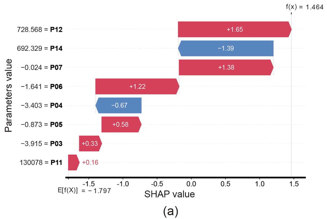 采用SHAP 瀑布图(论文 Fig.11 (a))分析单个 F4 样本的参数贡献。瀑布图能清晰展示每个参数对模型预测的正负贡献及大小:部分样本中 P14、P04 的低值对 F4 预测产生负向影响,结合热力学机理可知,活塞环磨损加剧窜气,本应使 P14、P04 升高,而样本中低值与先验知识矛盾,导致模型预测精度略有下降。
