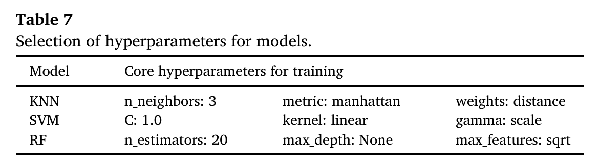 采用网格搜索 + 5 折交叉验证对 KNN、SVM、RF 三种模型进行超参数调优,最优参数见论文 Table7。