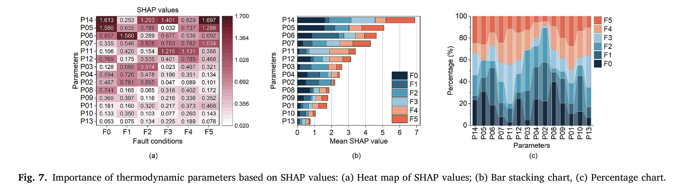 论文计算了 14 个参数在 6 类健康状态下的 SHAP 值,通过热图、堆叠柱状图、占比图展示参数重要性(论文 Fig.7 (a-c))。最终筛选出涡轮增压器后排气温度(P14)、缸套壁热流(P05)、窜气热流(P06)、窜气质量流量(P07) 等 8 个核心参数,为后续故障诊断的核心特征。