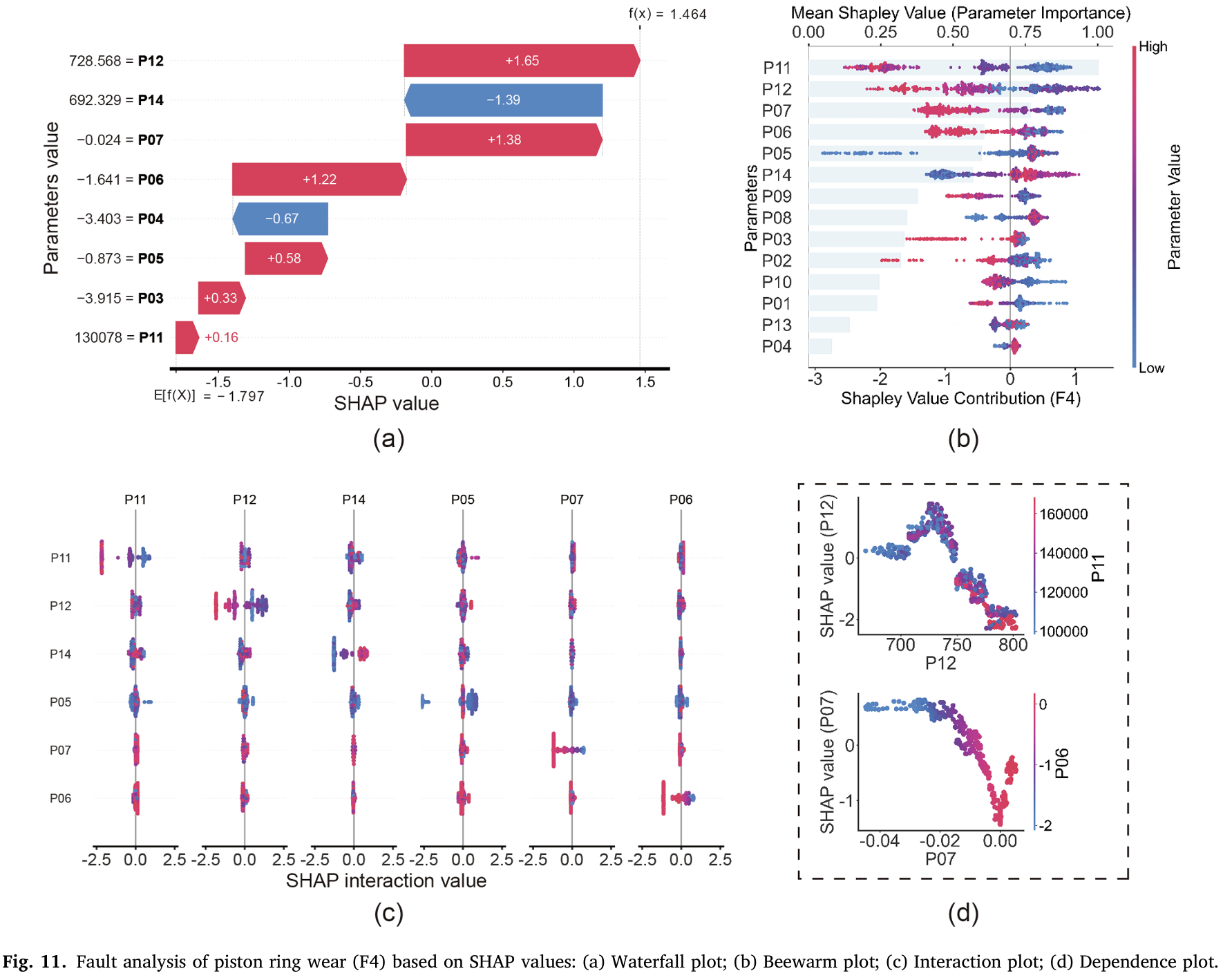 - 蜂群图(Fig.11 (b)):展示所有 F4 样本的参数 SHAP 值分布,发现 P11、P12、P07、P06 的低值是模型识别 F4 的关键特征;