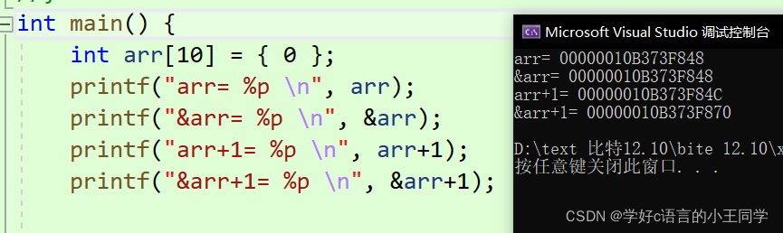 数组的地址+1 跳过整个数组的大小,所以&arr+1相对于&arr的差值是40.