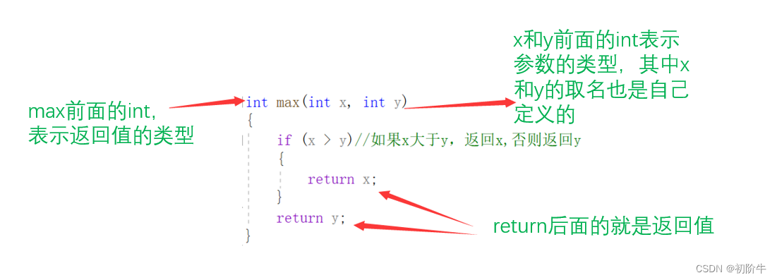 上述代码中max(a,b),max表示函数名。a和b是实参(函数参数)。 注意: 函数名:起名要有意义,不然写完自己可能都不知道是什么意思了。就算自己知道,那别人读起来会很头疼的,要考虑到他人的感受。毕竟很多时候,一个大型的程序都是由很多人分工完成。
