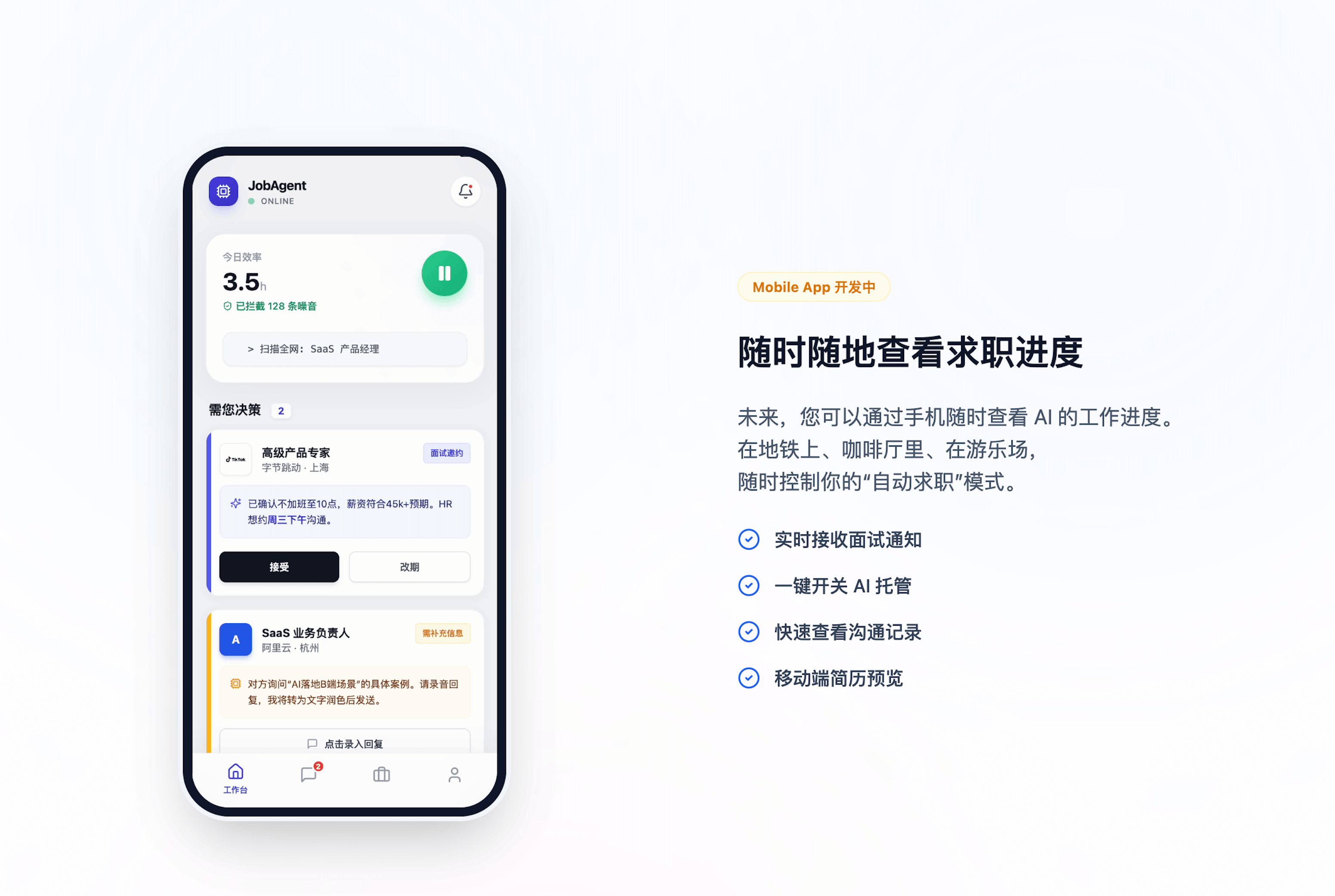 - 降低求职门槛:无论你是职场新人不懂求职技巧,还是资深从业者没时间打理求职事宜,AI 都能帮你精准对接机会,让价值被看见。