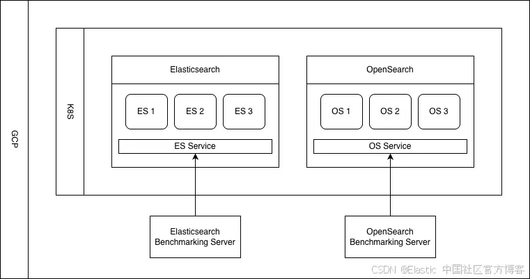 我们的测试运行在六台 e2-standard-16 cloud servers 上,每台有 16 vCPUs 和 64 GB RAM。在每台服务器上,我们为运行 search engine 节点的每个 Kubernetes pod 分配了 15 vCPUs 和 56 GB RAM,其中 28 GB 预留给 JVM heap。