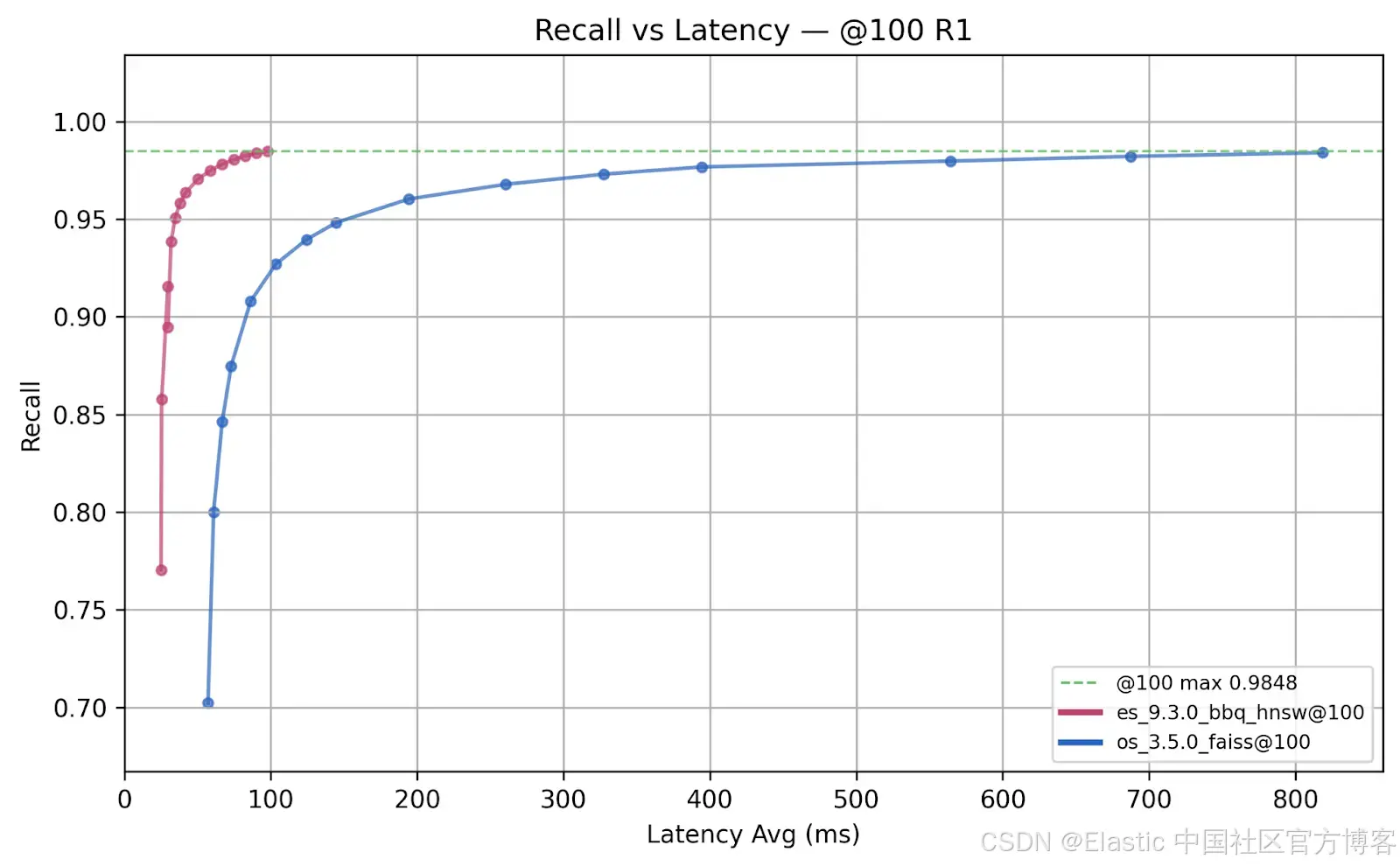 在图 2 中,每个点代表一种测试配置。最佳结果位于左上角,表示 更高召回率与更低延迟。Elasticsearch 的结果始终更接近左上角,相比 OpenSearch 在相同工作负载下表现出更好的速度和精度。