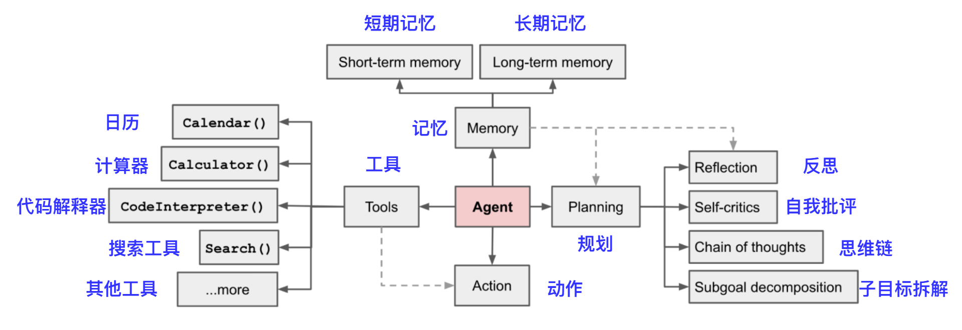 - Tool use(使用工具):智能体学会调用外部API来获取模型权重中缺失的额外信息(预训练后难以更新的知识),例如实时数据、代码执行能力、专有信息源等,从而扩展自身的能力边界。