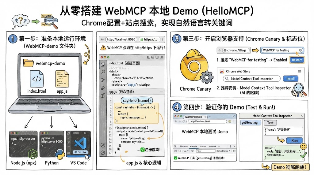 从零搭建WebMCP本地Demo:Chrome配置+站点搜索,实现自然语言转关键词