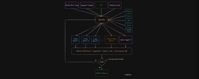 他弄的编排智能体叫 Zoe,主要负责:派生子智能体、编写提示词、为每个任务选择合适的模型、监控进度,并在 PR 准备好合并时通过 Telegram 通知作者。