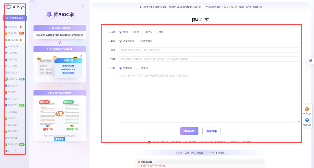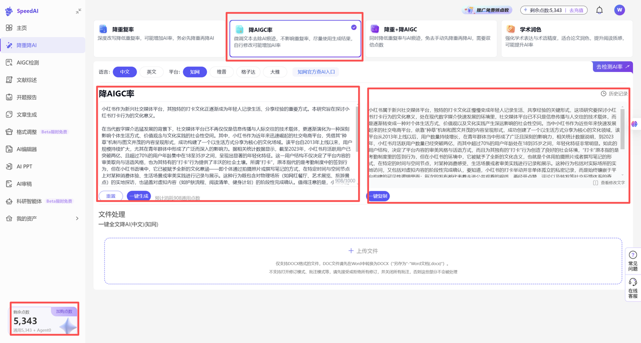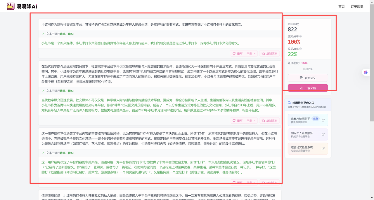 实测体验: 这个平台不仅有降AI,通常也集成了相关论文功能。