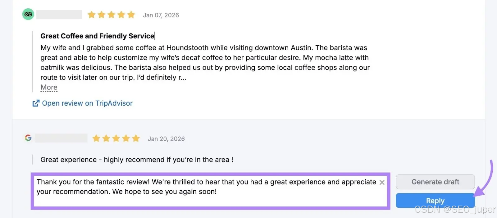 使用Semrush的评论管理工具,跨平台管理你的评论,并直接回复你的谷歌评论。你可以自己起草消息,也可以寻求AI的帮助。