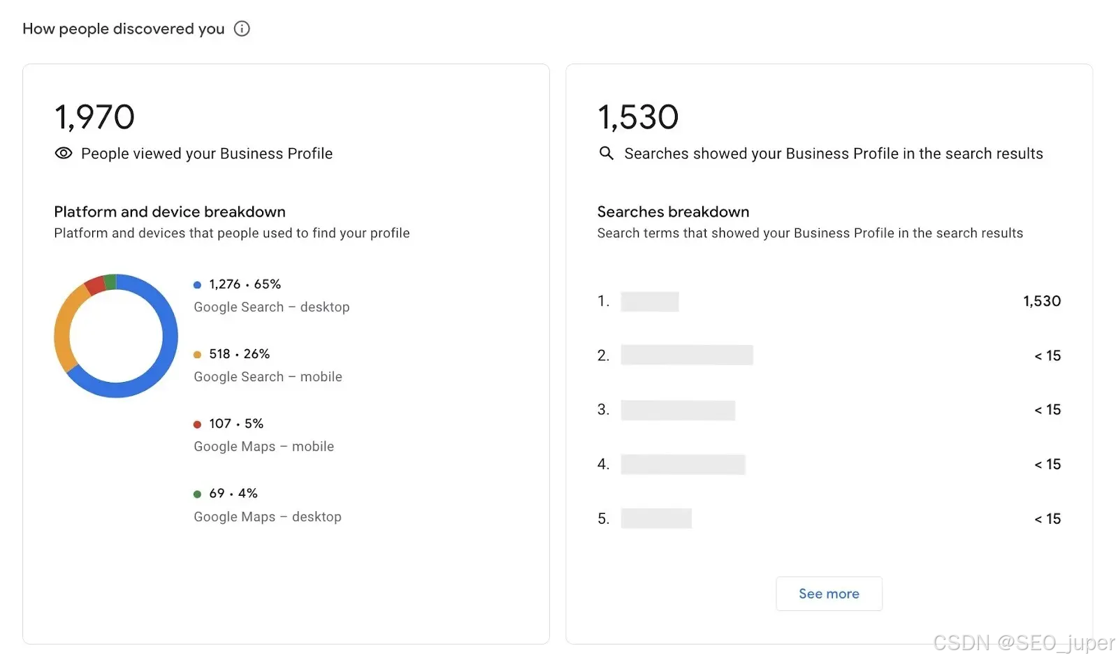 Google Business Profile 内置的分析仪表盘显示你的个人资料在搜索结果中的出现频率、你出现在哪些词汇等。