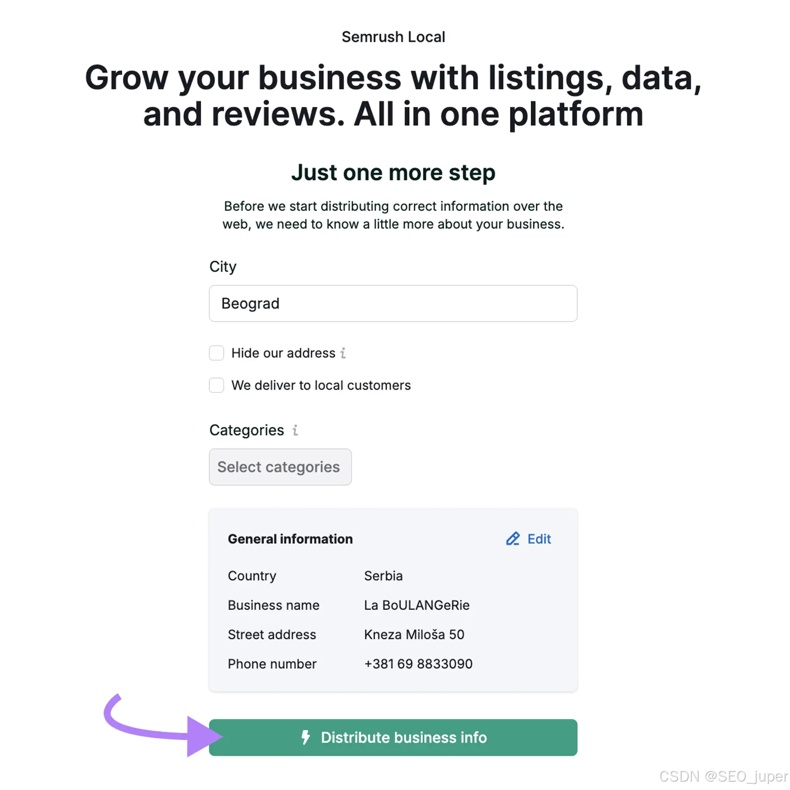 使用Semrush的房源管理工具,查看是否有遗漏或不准确的房源。注册一个计划,自动在多个目录中分发您的企业信息。