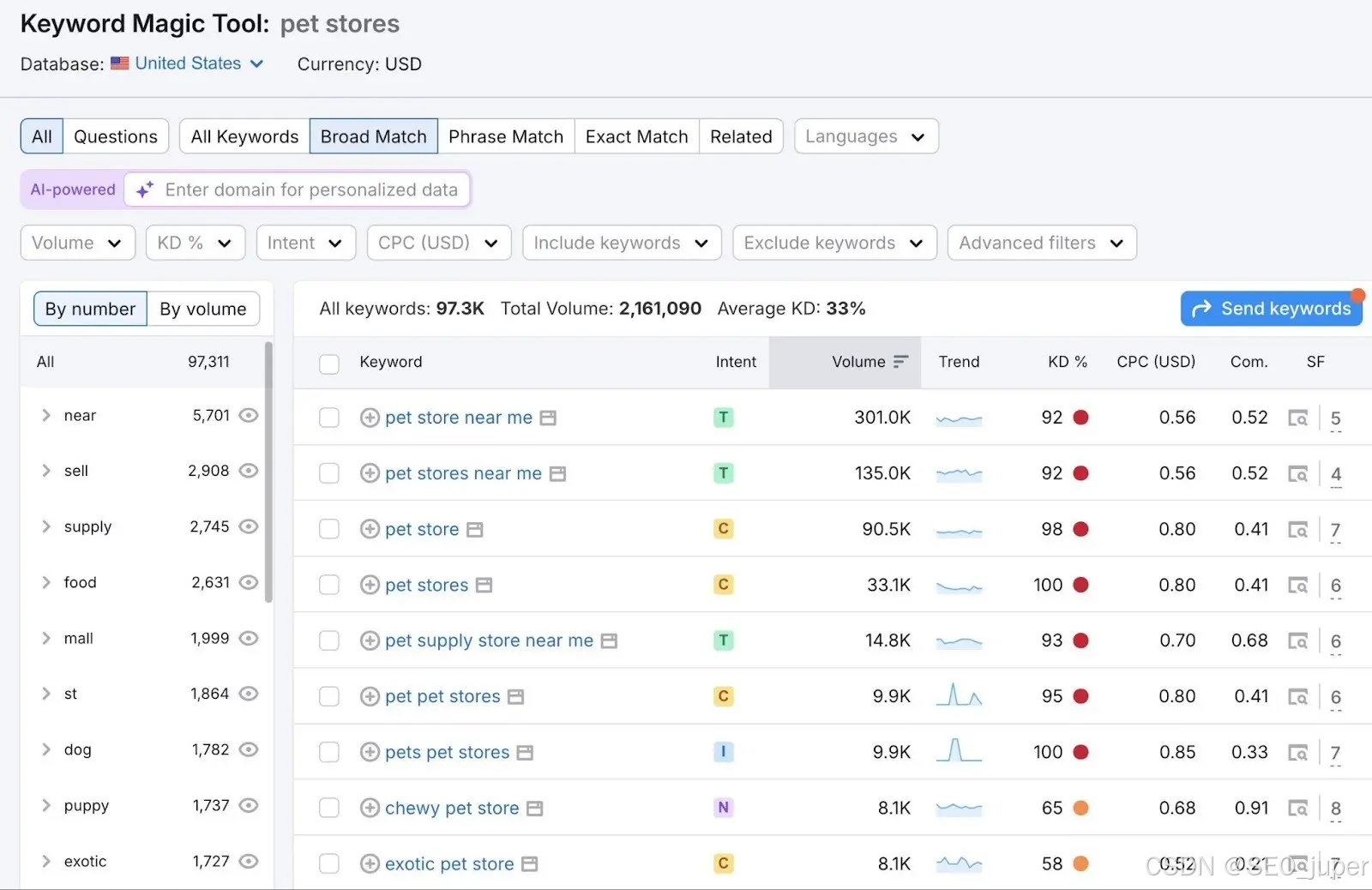 要进行本地关键词研究,可以在Semrush的关键词魔法工具中输入与你业务相关的种子词(与你的业务相关的广泛术语),以发现各种变体。优先选择与你的业务最契合且搜索量较好的词汇。