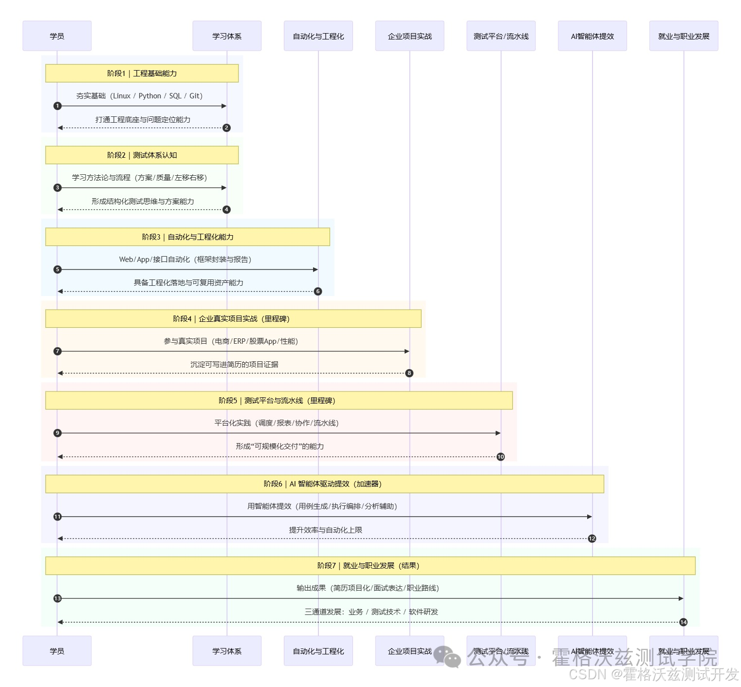 AI 不是玩具,而是提升效率的工程工具: 用智能体处理重复任务、生成用例草稿、辅助分析日志与缺陷归因,把效率拉开差距。这不是“噱头”,而是一种更像学徒制的培养方式: 我们承担培养成本,你用就业结果负责。你不仅会写用例,还要会把用例“跑起来、管起来、可视化起来”。用企业真实标准倒推学习体系,让你毕业时能拿出“工程证据”。你学到的是“底层能力”,所以通道会变多,而不是更窄。企业招聘偏实战、偏交付。你把