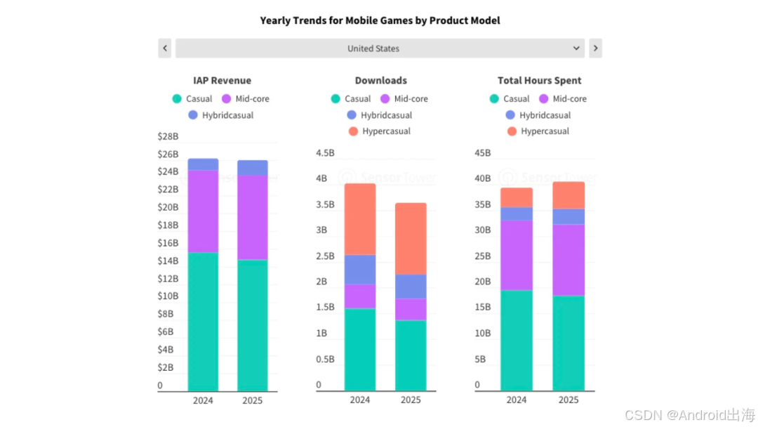 混合休闲游戏在收入端实现增长,而超休闲游戏则主要拉动了用户参与度。相比之下,传统休闲游戏的收入出现下滑。
