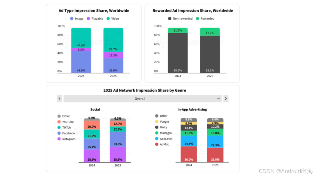 广告生态正在加速整合。视频广告仍然占据主导地位,但可玩广告的占比已出现显著提升,奖励视频也在持续增长。这一变化正在明显重塑创意策略,尤其是在中度游戏与休闲游戏之间,投放方式与素材结构的分化愈发明显。