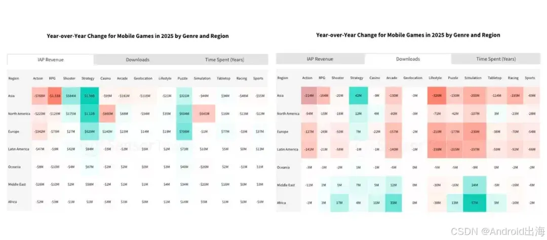 下载量基本持平,同比增长仅为0.8%,而内购收入增长了10.6%。这是一个结构性变化。美国市场多年来一直在预示这一趋势,下载量实际上在下降,而收入却在攀升。随着印度和巴西等高增长市场的成熟,过去五年下载量的爆发性增长放缓,行业的焦点已经决定性地转向了变现。