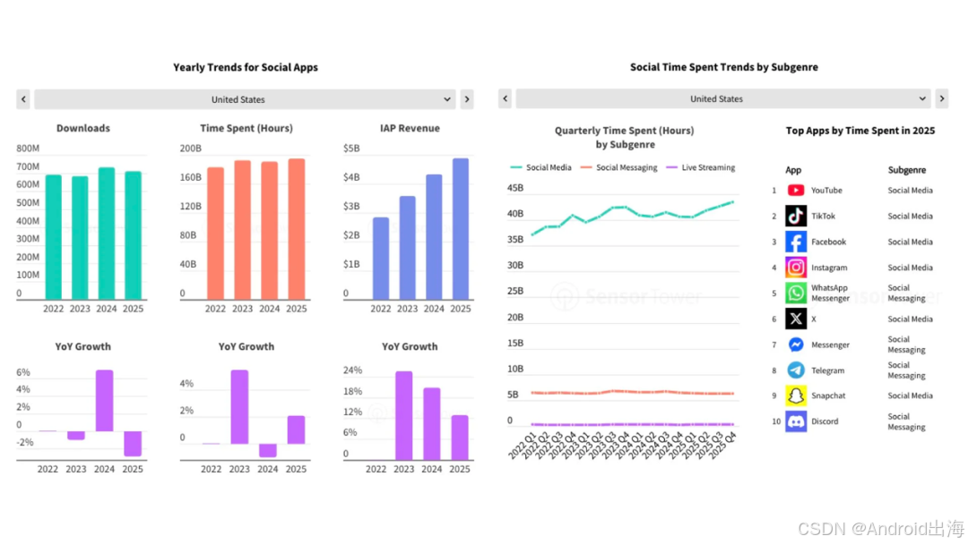 社交媒体与社交通讯应用如今占据了超过60%的移动端总使用时长。更值得关注的是,社交类应用的内购收入同比增长16%,达到150亿美元。