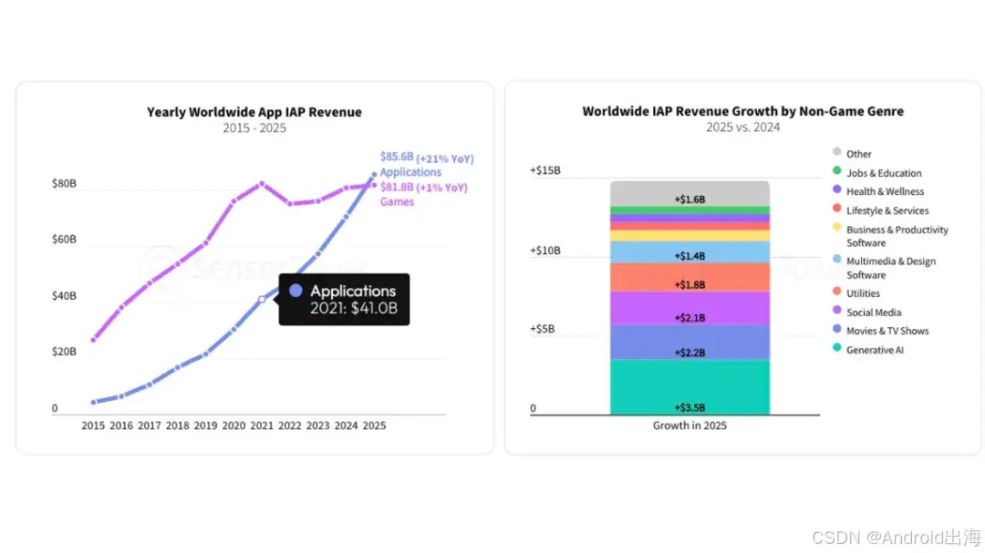 2025年,非游戏应用在内购收入上超过了游戏,并且这种差距还在不断扩大。应用的收入达85亿美元,而游戏收入818亿美元。