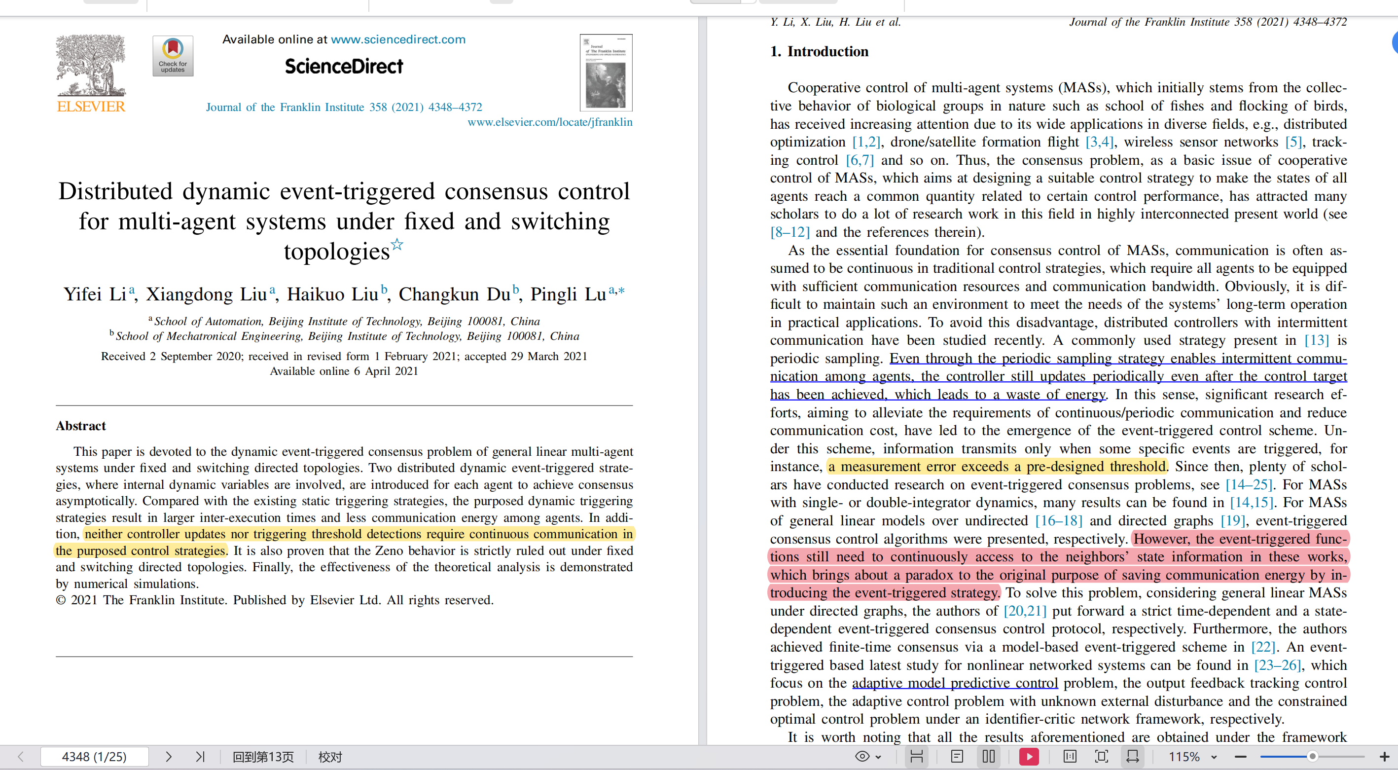 [1] Li Y , Liu X , Liu H ,et al.Distributed Dynamic Event-triggered Consensus Control for Multi-agent Systems under Fixed and Switching Topologies[J].Journal of the Franklin Institute, 2021(7).DOI:10.1016/j.jfranklin.2021.03.027.