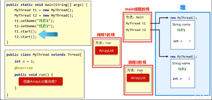 - 这个图表示main线程栈读取main方法,main方法进栈,然后,创建了两个线程对象,在堆中开辟内存空间,然后当执行start方法时,就会开启线程1和线程2自己的栈,run方法进栈.