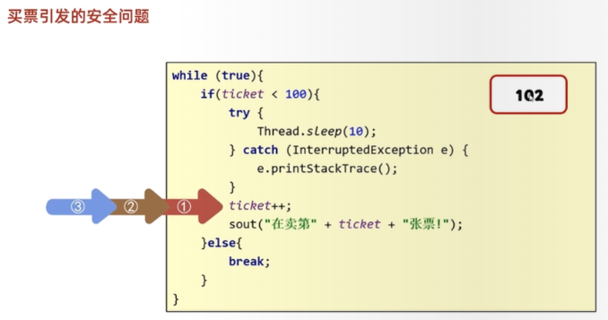 public class MyThread extends Thread { public static int ticket = 0; static Lock lock=new ReentrantLock(); @Override public void run() { while (true) { lock.lock(); try { if (ticket < 100) { System.out.println(getName() + ":正在卖第" + ticket + "张票"); ticket++; } else { break; } } catch (Exception e) { throw new RuntimeException(e); } finally { lock.unlock(); } } } } -