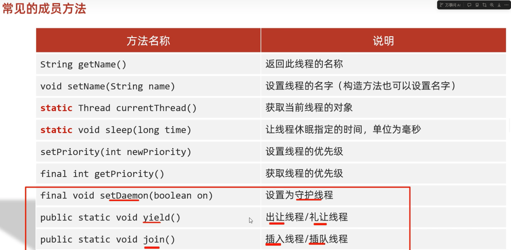 java中的CPU调度使用的是抢占式调度,然后的话,可以通过setPriority设置优先级,优先级越高,越可能抢到CPU,主打随机性。守护线程,如果非守护线程还没有结束,那么大家都正常运行,如果非守护线程都结束了,那么就会陆续结束守护线程。使用sleep方法进行线程的休眠,哪个线程执行到了这个方法,那么就进行休眠,单位为ms。多线程中的不安全性(线程在执行的过程中随时可能会失去CPU的执行权)线