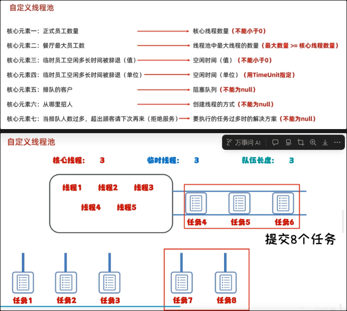 - 来了8个任务,线程池先创建3个核心线程来完成三个任务,然后长度为3,把任务4,5,6进入阻塞队列排队,任务7和8使用临时线程来进行操作