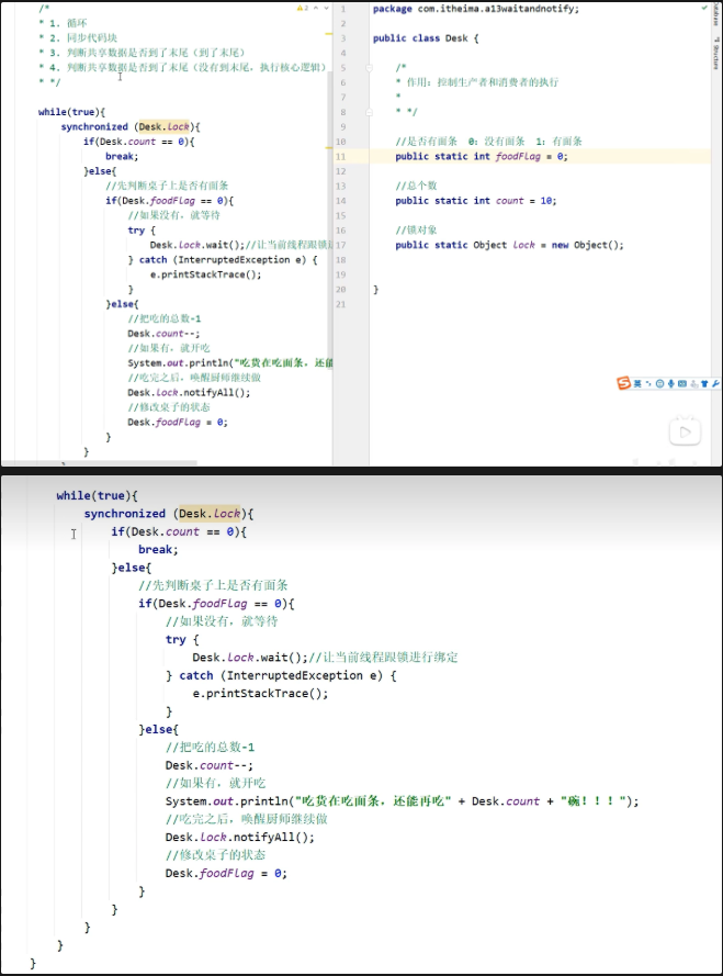 public class Cook extends Thread{ ArrayBlockingQueue<String> arrayBlockingQueue; public Cook(ArrayBlockingQueue<String> arrayBlockingQueue) { this.arrayBlockingQueue = arrayBlockingQueue; } @Override public void run(){ while(true){ try { arrayBlockingQueue.put("面条"); System.out.println("厨师做了一碗面"); } catch (InterruptedException e) { throw new RuntimeException(e); } } } } -