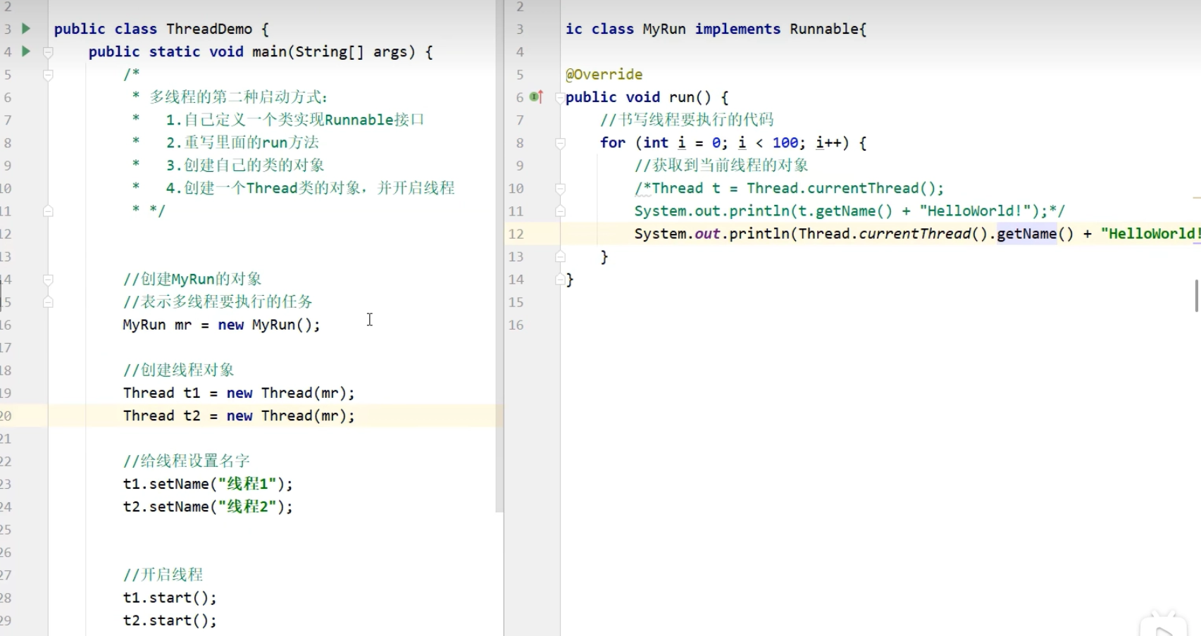 public static void main(String[] args) { MyThread myThread=new MyThread(); MyThread myThread1=new MyThread(); myThread1.setName("Rance1"); myThread.setName("Rance2"); myThread1.start(); myThread.start(); } static class MyThread extends Thread{ @Override public void run(){ String name=getName(); for (int i = 0; i < 100; i++) { System.out.println(name+": RanceXXX"); //出让线程,表示让出当前CPU的执行权 Thread.yield(); } } } - 通过实现Runnable接口,重写run方法来实现