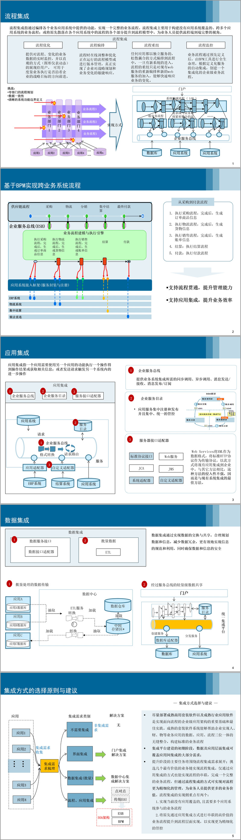 在具体实现层面,规划对四类集成需求制定了详细解决方案。界面集成通过企业门户实现界面组合、跳转与嵌入,提供一致的用户体验;流程集成借助 BPM 工具对跨系统流程进行编排、优化与监控,典型如 “从采购到付款” 流程的全链路贯通;应用集成通过 ESB 实现服务的集中注册与调用,支持同步、异步等多种交互模式;数据集成则通过 ETL 工具、主数据管理平台实现批量数据传输与核心数据的一致性管控。同时,规划明确了集成方式的选择原则,优先采用成熟商用软件,初期以数据与应用集成为主,逐步推进高价值业务流程的集成优化。
